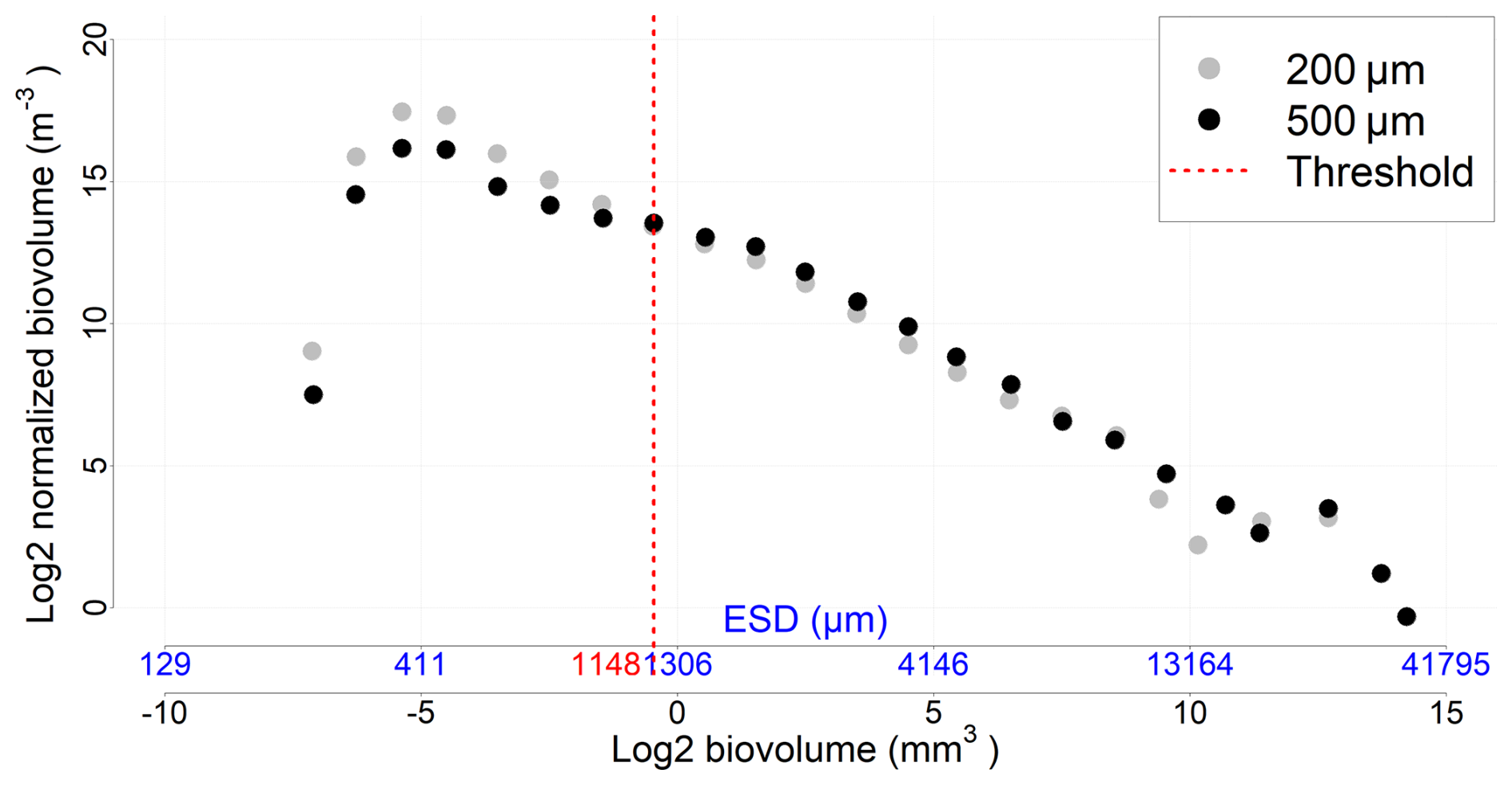 (2) log 2 Zooplankton biovolume ( mm 3 m - 3 ) Interval of each class size ( Δ volume mm 3 )