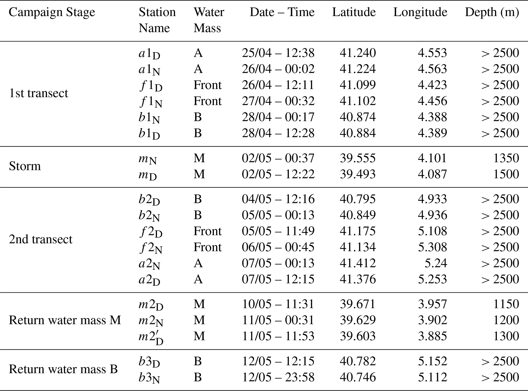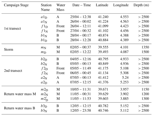 Table 1Station details. In Station Name, “D” stands for day and “N” stands for night. Depth values are approximate (± 50 m) for the station within the water mass M. Depths indicated as “> 2500” correspond to stations deeper than 2500 m.