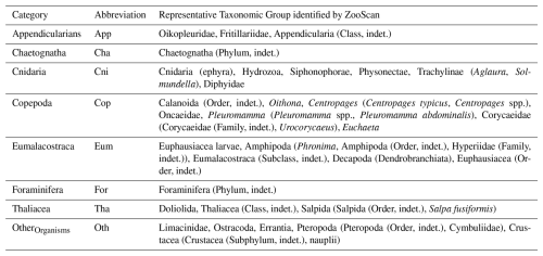 Table 2Zooplankton taxonomic categories and their representative groups ( 1 % of the concentration within their category) identified by ZooScan. Taxonomic categories labelled “indet.” denote taxa identified only to the given taxonomic rank when finer identification was not possible.