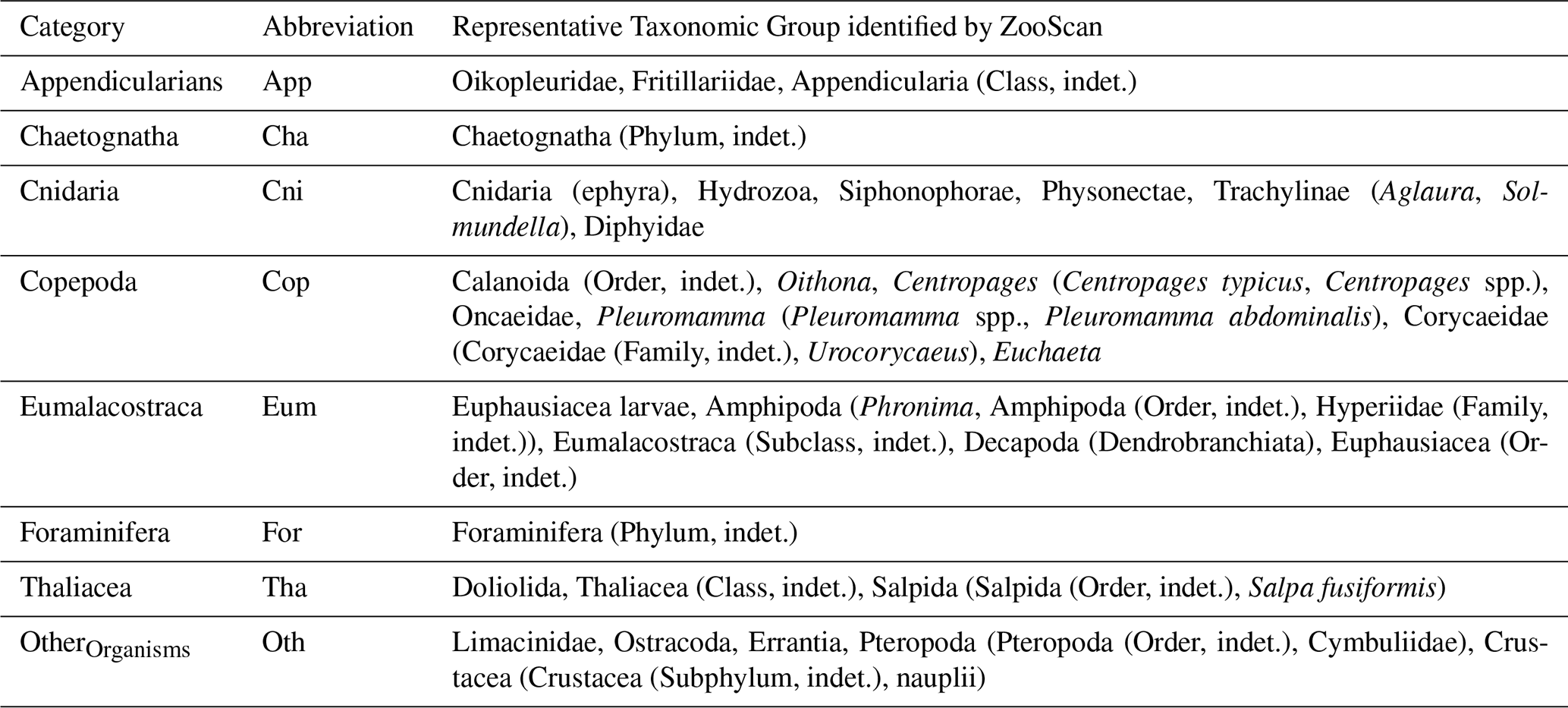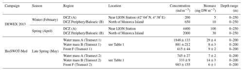 for other reasons (e.g., sample condition, image quality during scanning) and therefore could not be assigned to a taxonomic level finer than the order. For example, 65 % of copepods were classified as Calanoida indeterminate. Consequently, although 101 taxa were detected, they have been grouped into eight main categories: Appendicularia, Chaetognatha, Copepoda, Cnidaria, Eumalacostraca, Foraminifera, Thaliacea, and OtherOrganisms (Table 2). Table 2 does not list all recognized taxa within each of the eight categories, but only those that accounted for at least 1 % of the total concentration within their category. The last category, OtherOrganisms, includes all remaining taxa that did not belong to any of the designated classes and were present in very low numbers in all samples. Zooplankton concentration (number of individuals m−3) was calculated from the number of validated vignettes in ZooScan samples, considering the scanned fraction and the sampled volume from the nets.