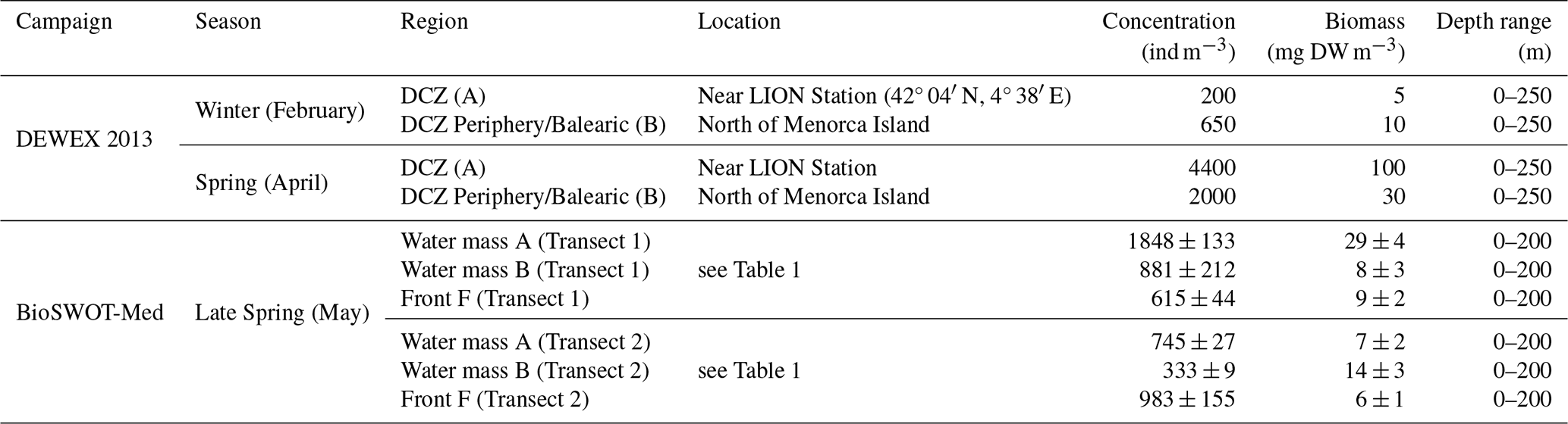 stocks and composition during late spring, northeast of Menorca, along two north-south transects that crossed the North Balearic Front separating central waters of the Northwestern Mediterranean Sea gyre from peripheral waters originating from the Algerian basin. During the BioSWOT-Med campaign, vertical triple-net tows with 200 and 500 µm meshes were carried out at three depths (100, 200, and 400 m), and the samples were processed with ZooScan to classify organisms into eight taxonomic groups. Zooplankton distributions were analyzed for the surface layer (0–100 m), a mid-depth layer (100–200 m), and a deeper