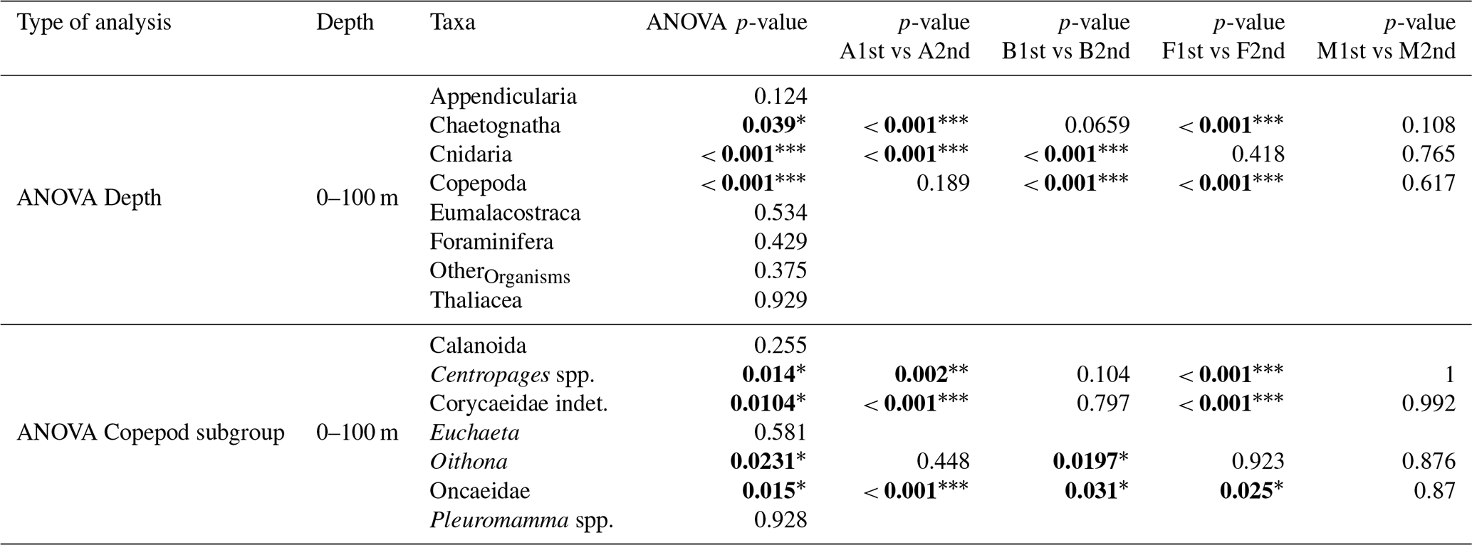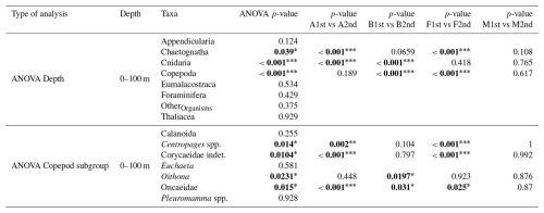 Using R version 4.4.1 (Team, 2025), one-way analyses of variance (ANOVA) were conducted to test differences in absolute concentrations across each taxonomic category. Prior to performing the ANOVA, the normality of residuals was assessed using the Shapiro-Wilk test and the homogeneity of variances verified with Levene's test (car package, version 3.1-3; Fox and Weisberg, 2019). ANOVAs were then performed for five factors: water mass, layer, period (day or night), transect (storm effect) and copepod subgroup (DVM pattern). Copepod subgroups were selected if their total concentration exceeded 1 % of the overall copepod assemblage, which resulted in the selection of seven copepod taxa. For each ANOVA showing a significant result (p<0.05), Tukey's HSD post hoc tests were applied to identify significantly different groups. In addition, a permutational multivariate analysis of variance (PERMANOVA) was used to test differences in community composition between water masses. The analysis was performed on Hellinger-transformed relative concentrations of taxonomic groups, with significance assessed using 999 permutations.