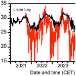 Three events were recognised in summer 2023 when the temperature of tidal water reached or exceeded 25 °C, namely from 22 to 25 June, 20 to 22 August, and 6 to 8 September (Fig. 3b). These high waters occurred in late afternoon between 16:00 and 19:20 CET. The preceding high waters, which occurred early in the morning, were cooler by 7.8 K on average. The mean temperature difference between day and night high waters, or those in the morning and in the evening, was 2.6 K before and after the warm events. The water temperatures followed the trend of the air temperature in the salt marsh (Fig. 6).