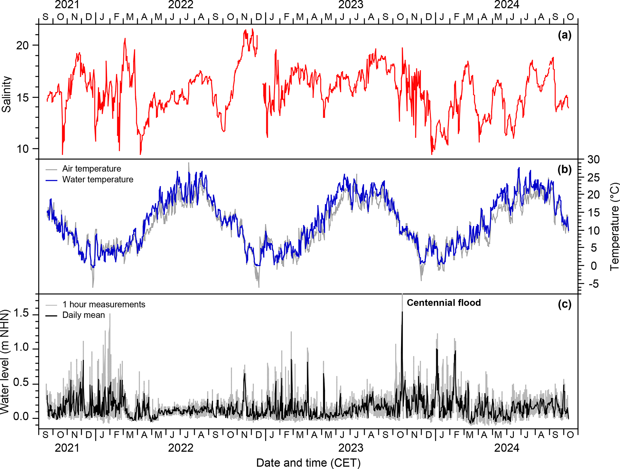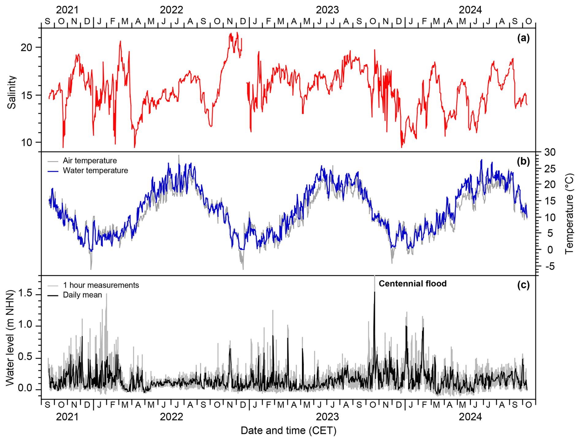 Figure 2Daily mean salinity (a), temperature (b), and water level (c) at Bottsand lagoon.