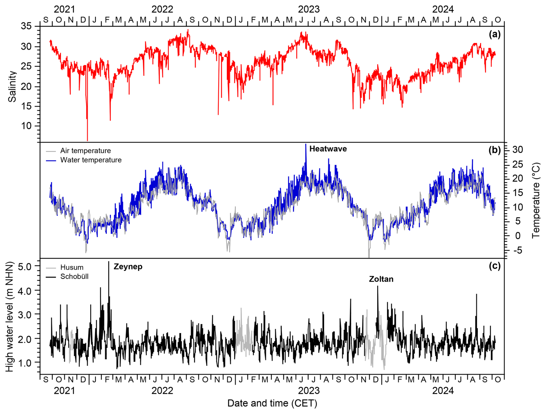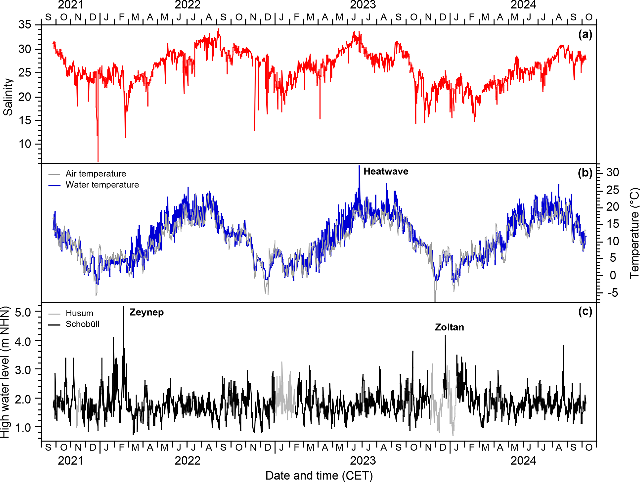 Figure 3High water salinity (a), temperature (b), and water level off Schobüll and at Husum (c). “Zeynep” and “Zoltan” refer to the two ranked storm surges during the investigation period.