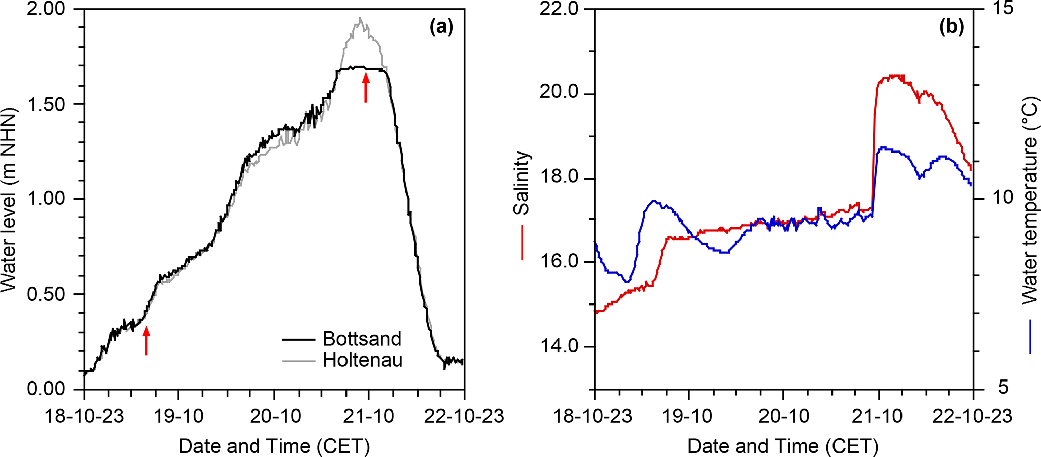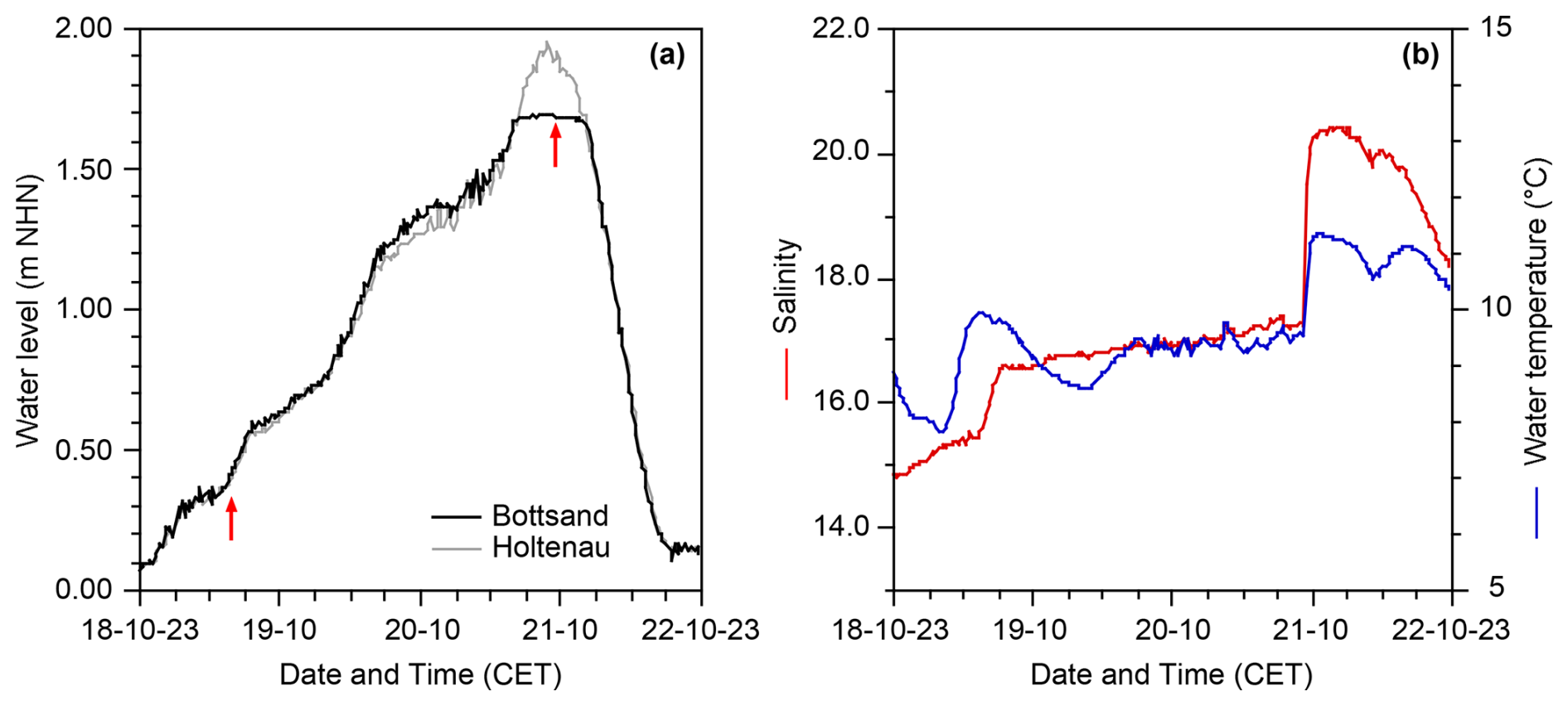 Figure 4Water level at Bottsand and Holtenau (a), temperature, and salinity during the Centennial Flood at Bottsand (b). The red arrows in (a) mark the salinity rises observed at Bottsand.