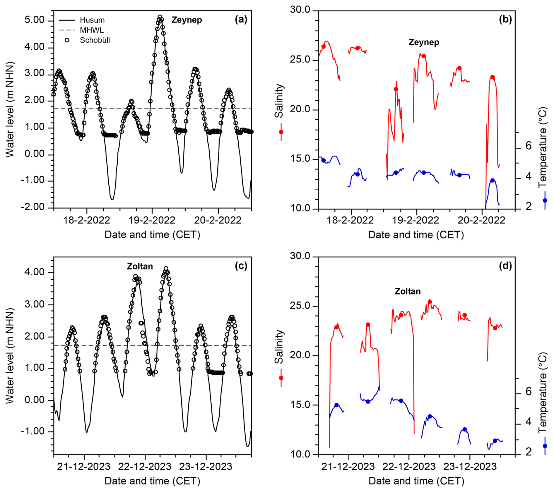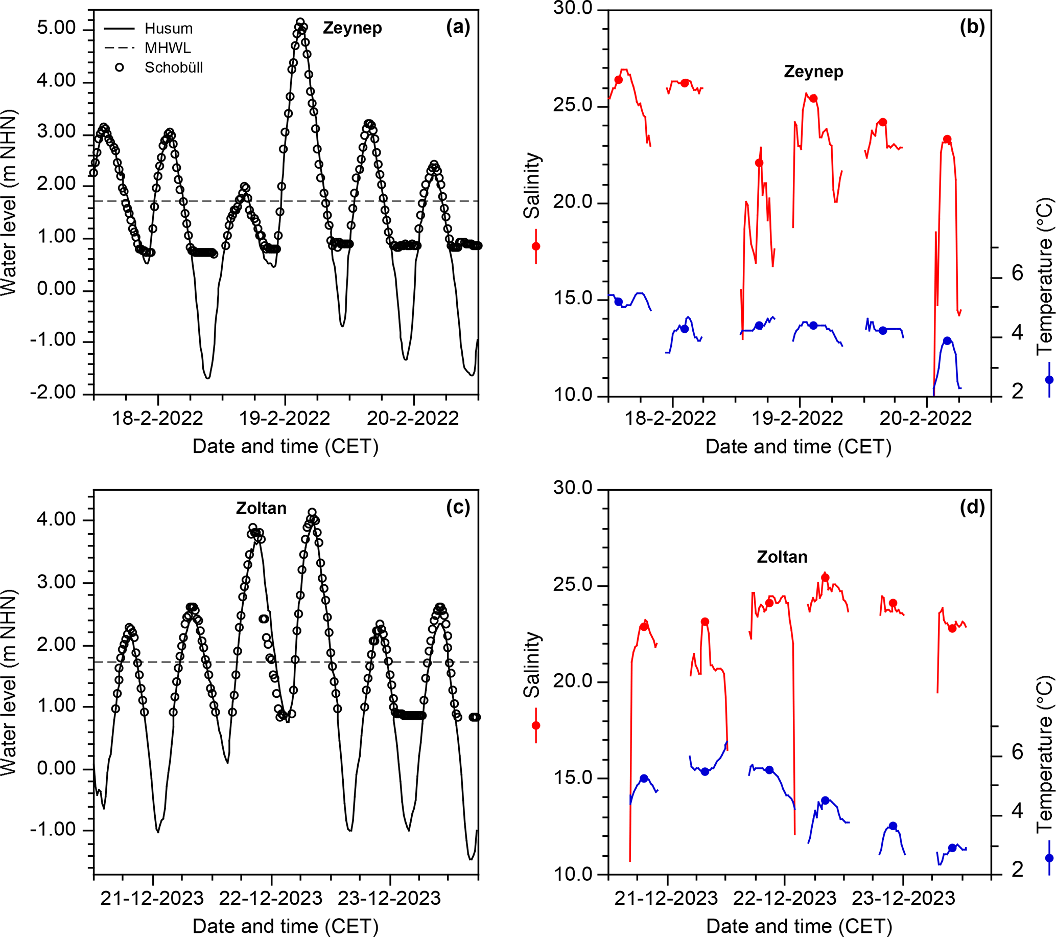Figure 5Water level (a, c), temperature and salinity (b, d) during the storm surges “Zeynep” and “Zoltan” off Schobüll and at Husum (water level “Zeynep” after Bundesamt für Seeschiffahrt und Hydrographie, 2023). The dots mark the measurements of temperature and salinity at high water times.