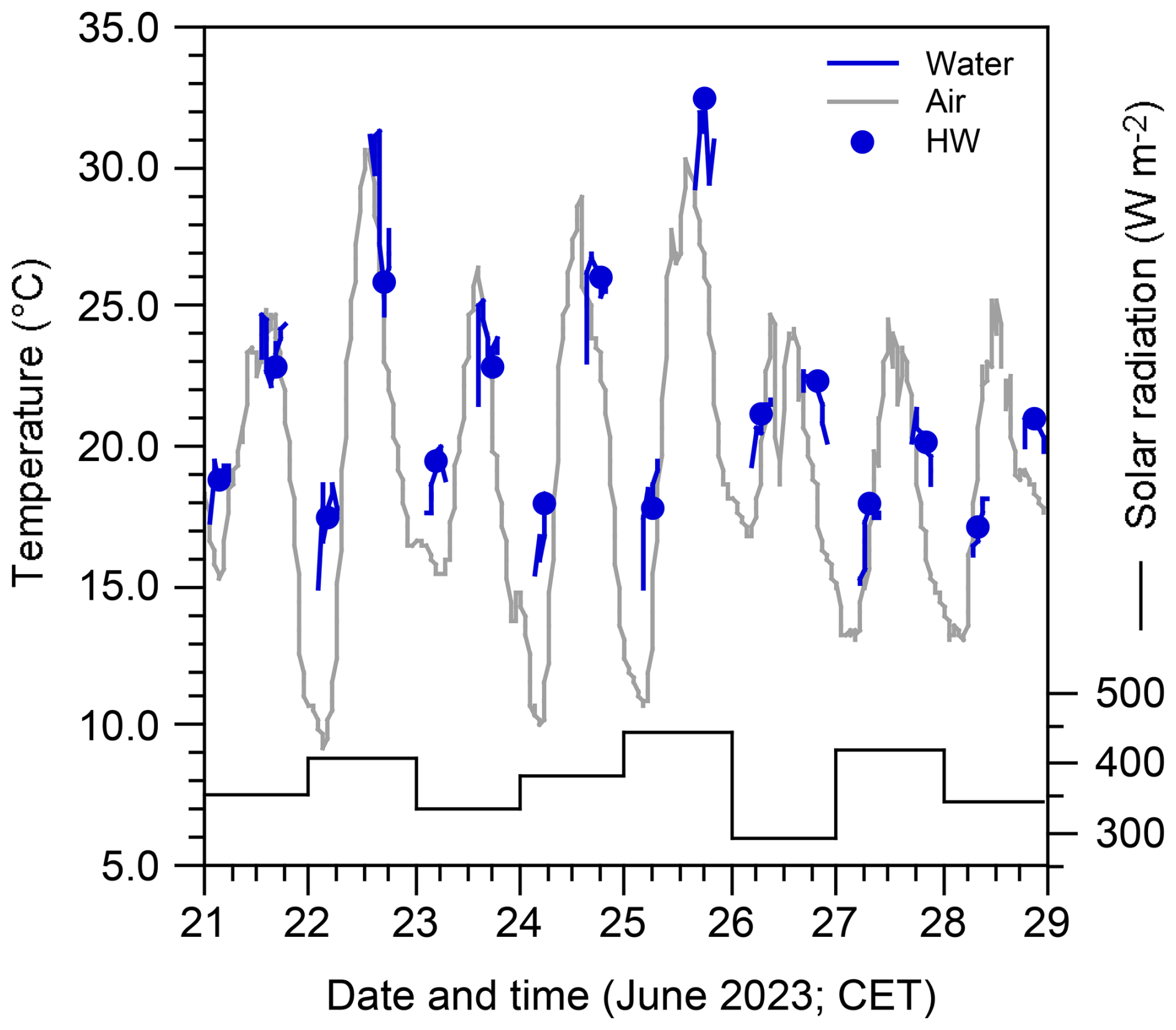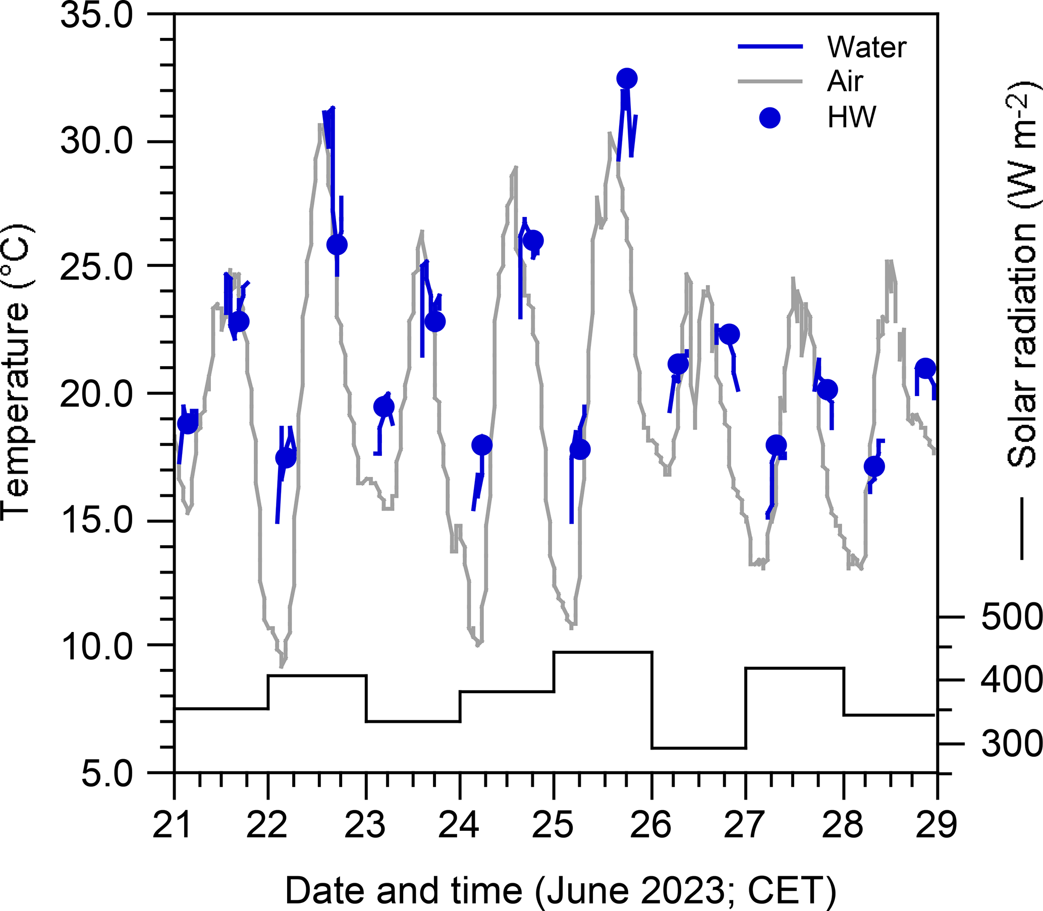 Figure 6Temperatures and solar radiation during the North Sea heat wave off Schobüll in June 2023 (solar radiation after https://www.schobuell-wetter.de, last access: 8 January 2026). The dots mark the water temperature measurements at high water times.