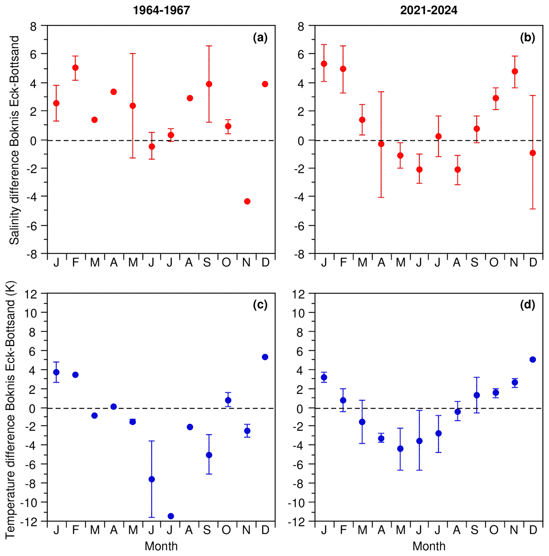 Figure 7Mean monthly salinity (a, b) and temperature (c, d) differences between Bottsand lagoon and Boknis Eck. Dots: mean values, error bars: range of values.