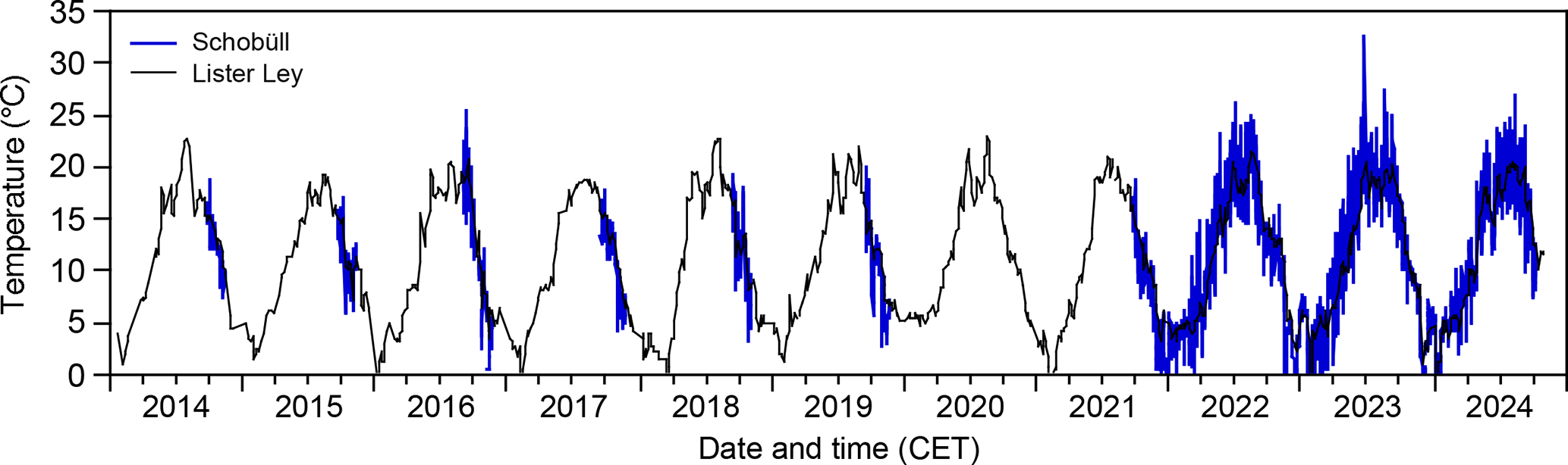 Figure 8High water temperatures off Schobüll and surface water temperatures at Lister Ley monitoring station during the years 2014 through 2024.