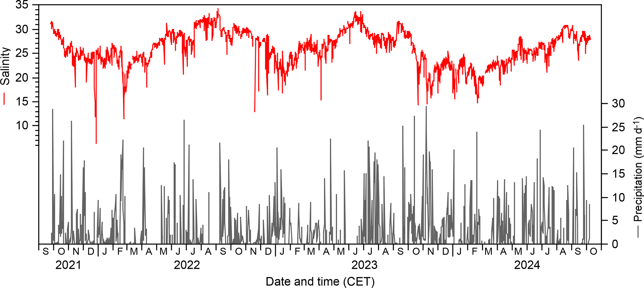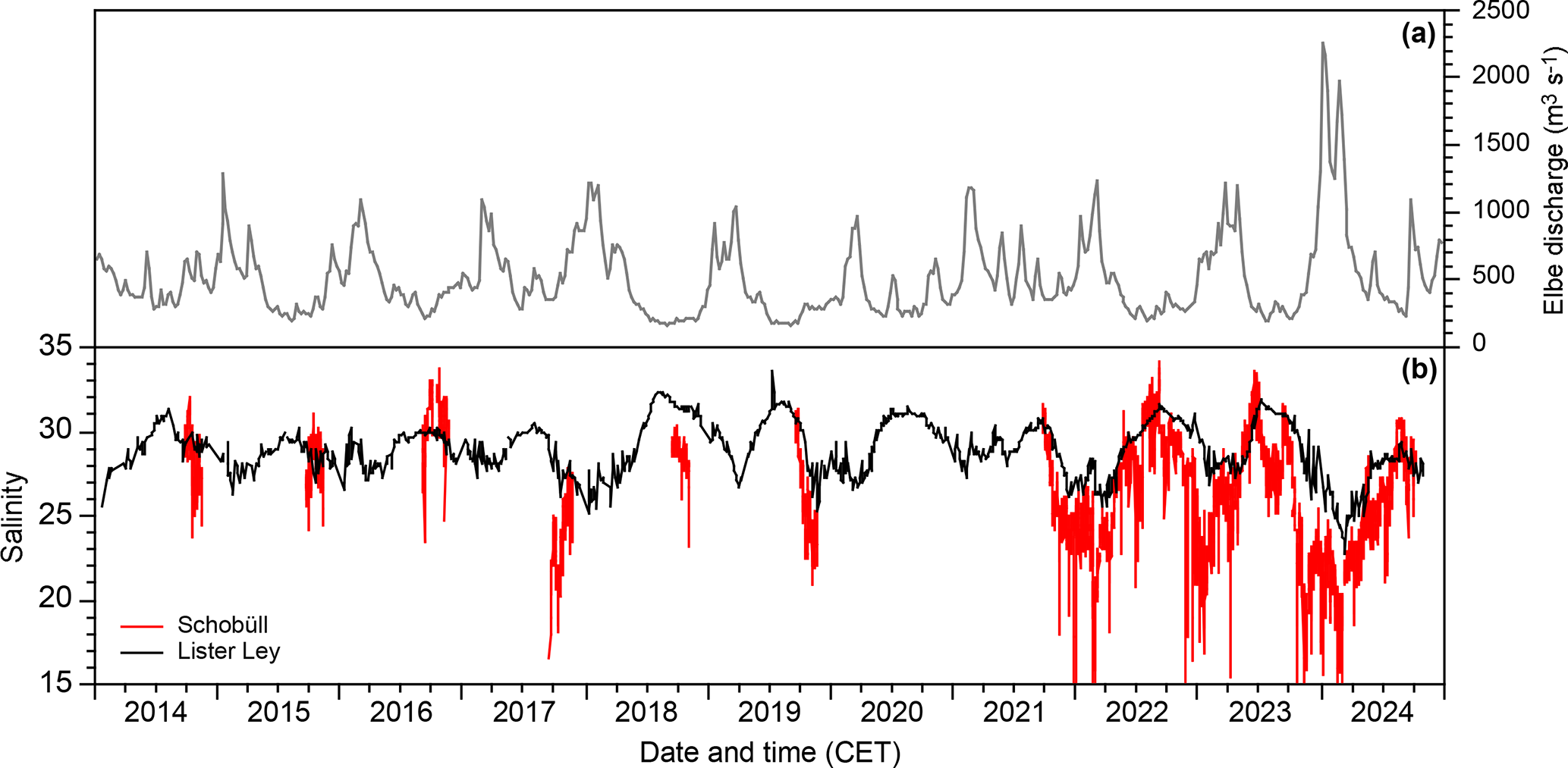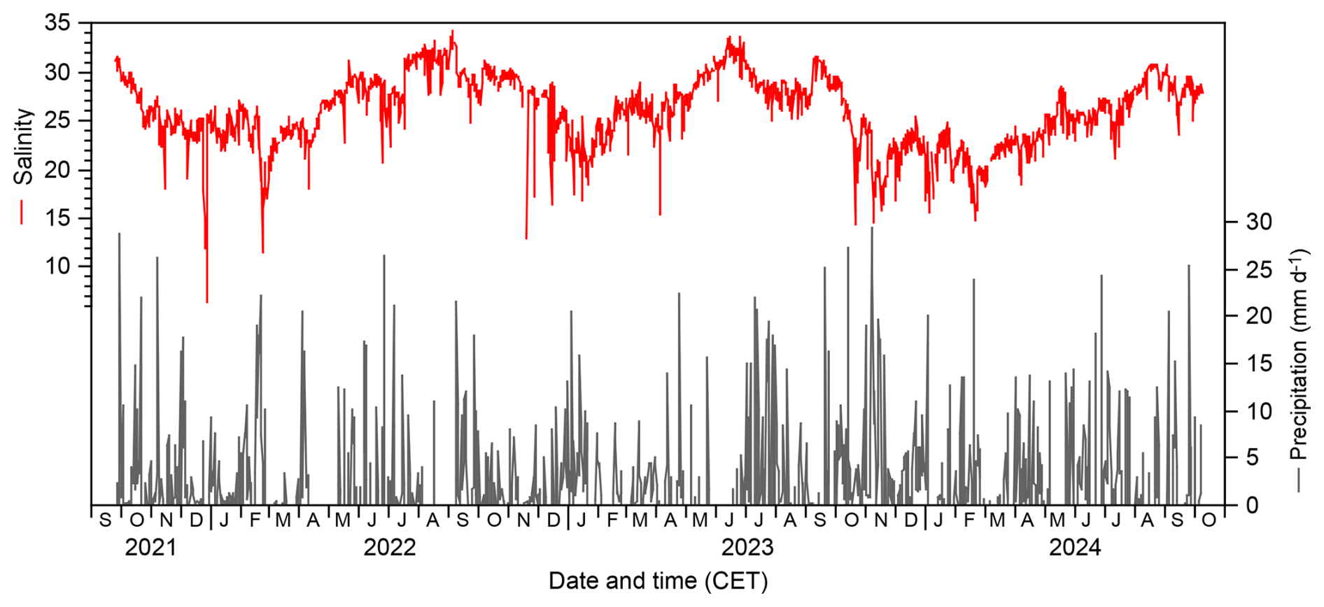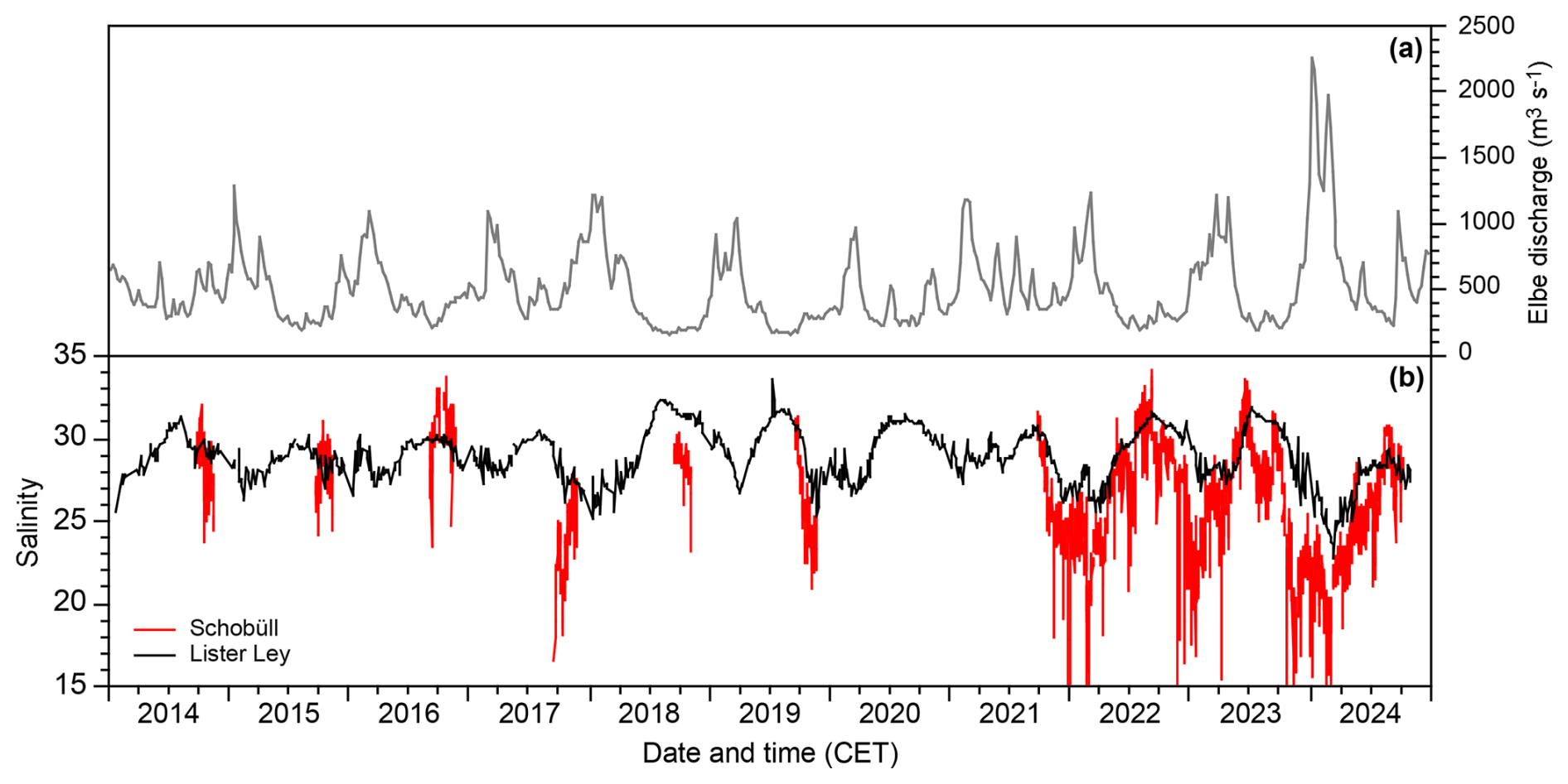 The salinities ranged from 5.4 to 22.3, with a mean value of 15.6±2.3 units (1 sigma, n=79 756). The annual mean ranged from 14.7 in 2023/2024 to 16.9 in 2022/2023. The strongest salinity fluctuations were recognised in winter, with generally high values in November and December, and low values in January and February. After high values in March and low values in April to May, the salinities increased again. The summer trend was interrupted by one to two month minima that did not occur at the same time every year (Fig. 2a).