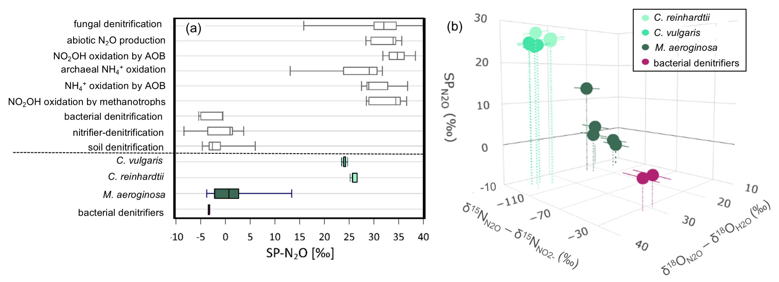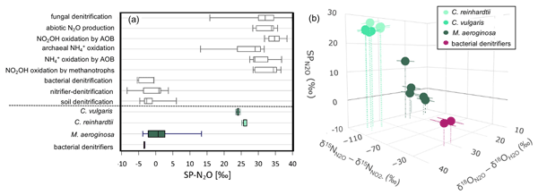 Figure 2(a) The range of SP-N2O reported for different N2O production pathways from previously published values (Denk et al., 2017) in white (above dashed line) and obtained from this study in colour (below the dash line). The centre lines of the box show the median, the box edges the quartiles and the whiskers represent minimum/maximum values. (b) Findings from this study on the 3D N2O isotope composition for microalgae (C. vulgaris, C. reinhardtii), cyanobacteria (M. aeruginosa) and bacterial denitrifier samples, where bulk isotopes (δ18O-N2O and δ15N-N2O) are reported relative to H2O (δ18O-N2O – δ18O-H2O) and NO2- (δ15N-N2O – δ15N-NO2-), respectively. Error bars represent uncertainty in substrate correction (note δ18O-N2O error bars are too small to visualise, see Table 1 for values). See Table 1 for microalgal and cyanobacterial N2O production rates.