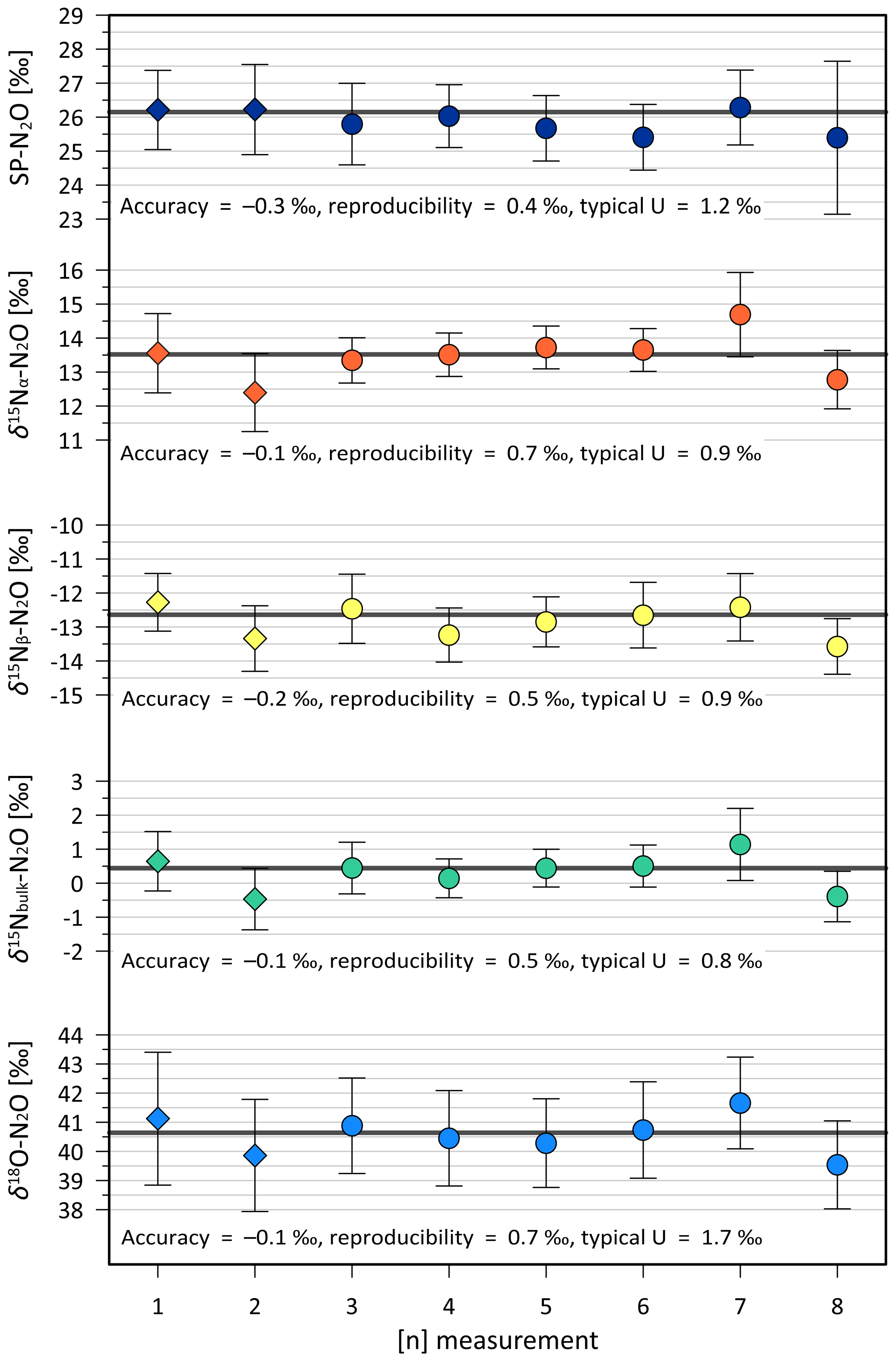 Figure 1Reproducibility of the analytical system for all isotopomer species. Diamonds show isotope results from USGS52-in-air measurements used to verify the robustness of the extraction system. Filled circles show measurements of USGS52-in-air as quality control standard during the measurements of unknown samples. Error bars indicate the propagated uncertainty for each measurement. Thick black lines indicate the target value for USGS52 (Table A2). Typical uncertainty (U) is calculated as the average of the uncertainties from each individual point in the respective panel.