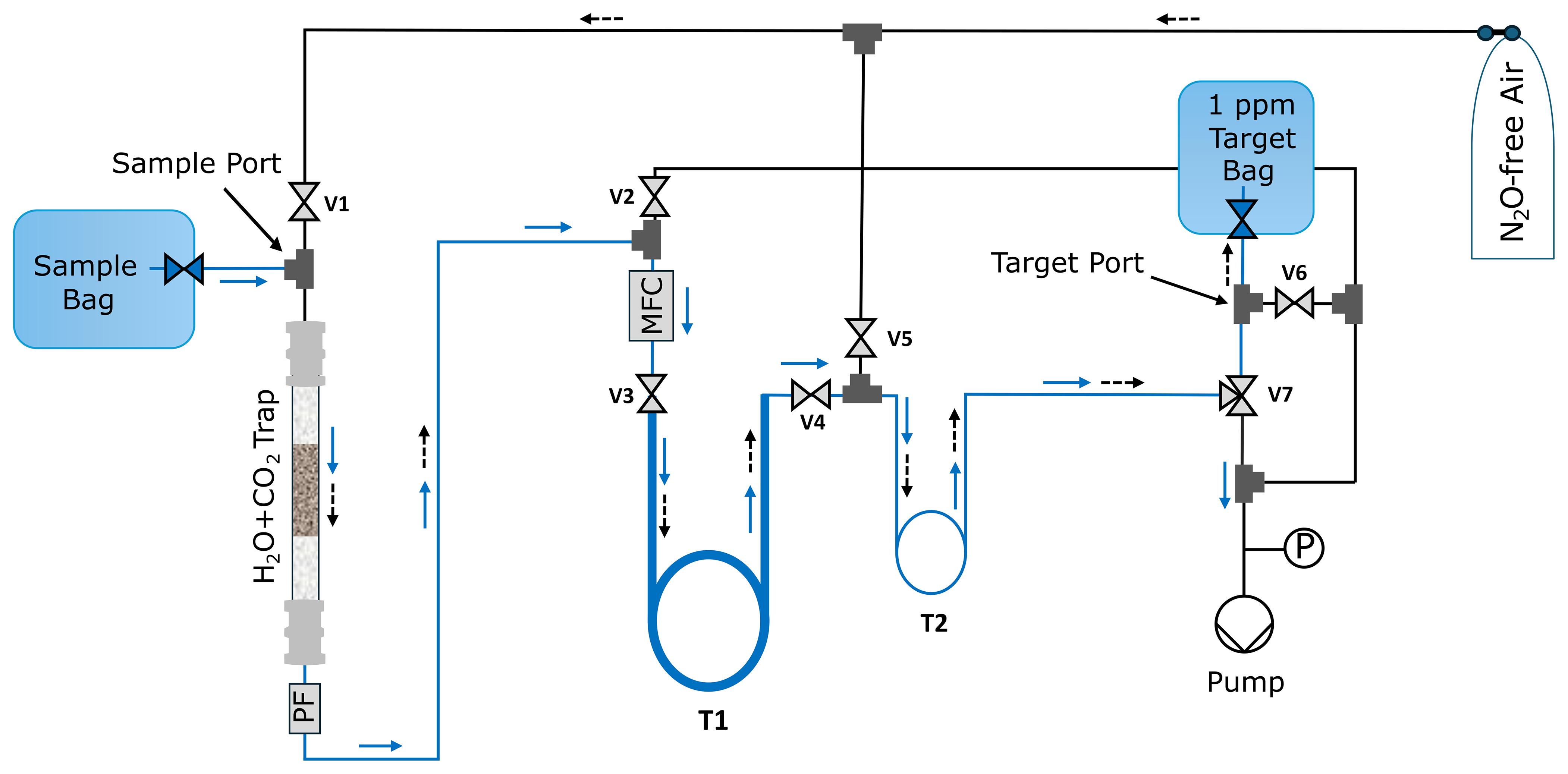 Figure A1Schematic of the N2O extraction line with sample and target bags. The flow pathways for the sample gas are indicated by solid blue arrows.