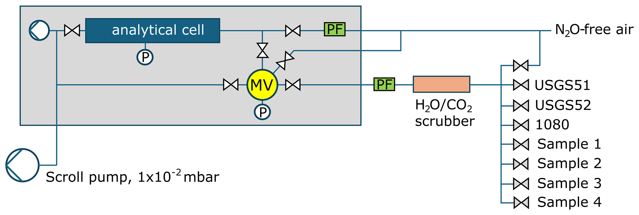 A schematic overview of the measurement sequences is shown in Supplement Sect. S4. Measurement sequences comprise of a series of measurement blocks of isotope reference gases, working standards and samples. Each gas sample was injected into the pre-evacuated cell of the LGR, before being locked in and measured for ten minutes before the cell was evacuated and flushed with N2O-free air in preparation for the consecutive analysis. Up to five blocks of the working standard (1080) are measured within each sequence to monitor instrumental drift. Following the first 1080 block, the N2O amount correction function is determined. For that, reference gases are diluted with N2O-free air inside the MV without changing their isotopic composition prior to their injection into the LGR. USGS51-in-air and USGS52-in-air are each analysed at five N2O mole fraction levels over a range of 0.33 to 1.5 ppm with five repetitions per N2O level. This is followed by measurements of up to four samples, each of which is bracketed by blocks of ten USGS51-in-air measurements at matching N2O mole fractions. The pathway to inject samples and reference gases includes further purification with a chemical scrubber and all steps of gas handling and analysis follow the principle of identical treatment (PIT) (Werner and Brand, 2001) as much as possible.