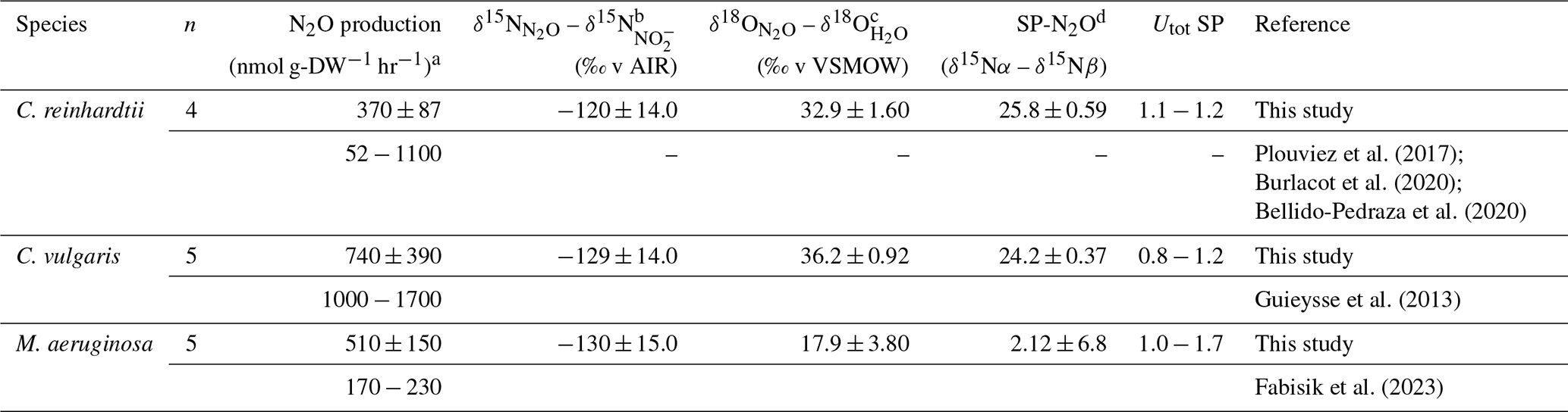 Table 1The production rate and isotope composition of N2O by two eukaryotic microalgae (C. reinhardtii and C. vulgaris) and one prokaryotic cyanobacteria (M. aeruginosa). Values for N2O production and SP are reported as the mean ± SD of laboratory replicates, and the range of analytical uncertainty of the individual SP measurement (Utot) are also shown. Values for bulk isotopes (δ15N-N2O and δ18O-N2O) are reported as the mean ± SD of the laboratory replicates relative to the minimum – maximum source isotope range for NO2- and H2O, respectively. Letters indicate differences between species, see footnotes for associated ANOVA outputs.