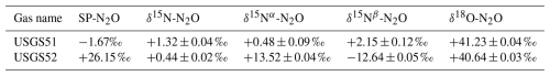 Table A2Certified SP-N2O values for USGS51 and USGS52, adopted for the USGS51-in-air and USGS52-in-air reference gases (Ostrom et al., 2018) and used for value assignment of the reported measurements in a 2-point calibration for SP-N2O. Both δ15N-N2O and δ18O-N2O are determined in a 1-point calibration based on USGS51 only.