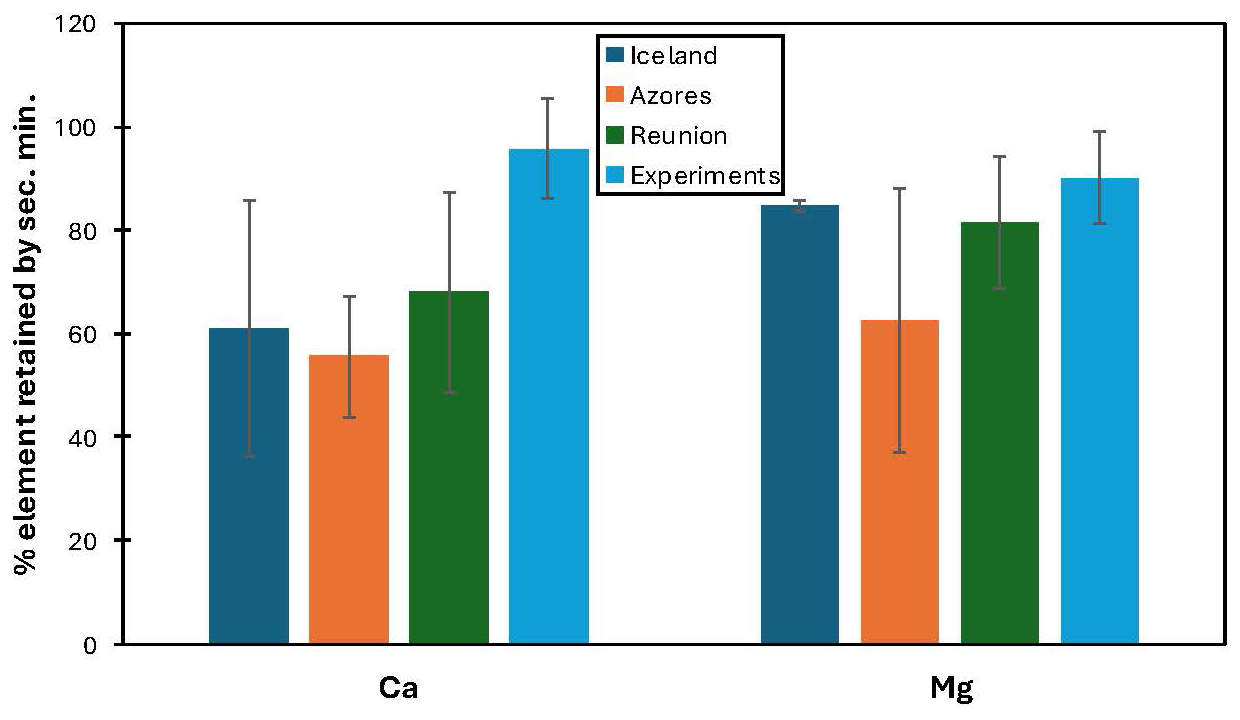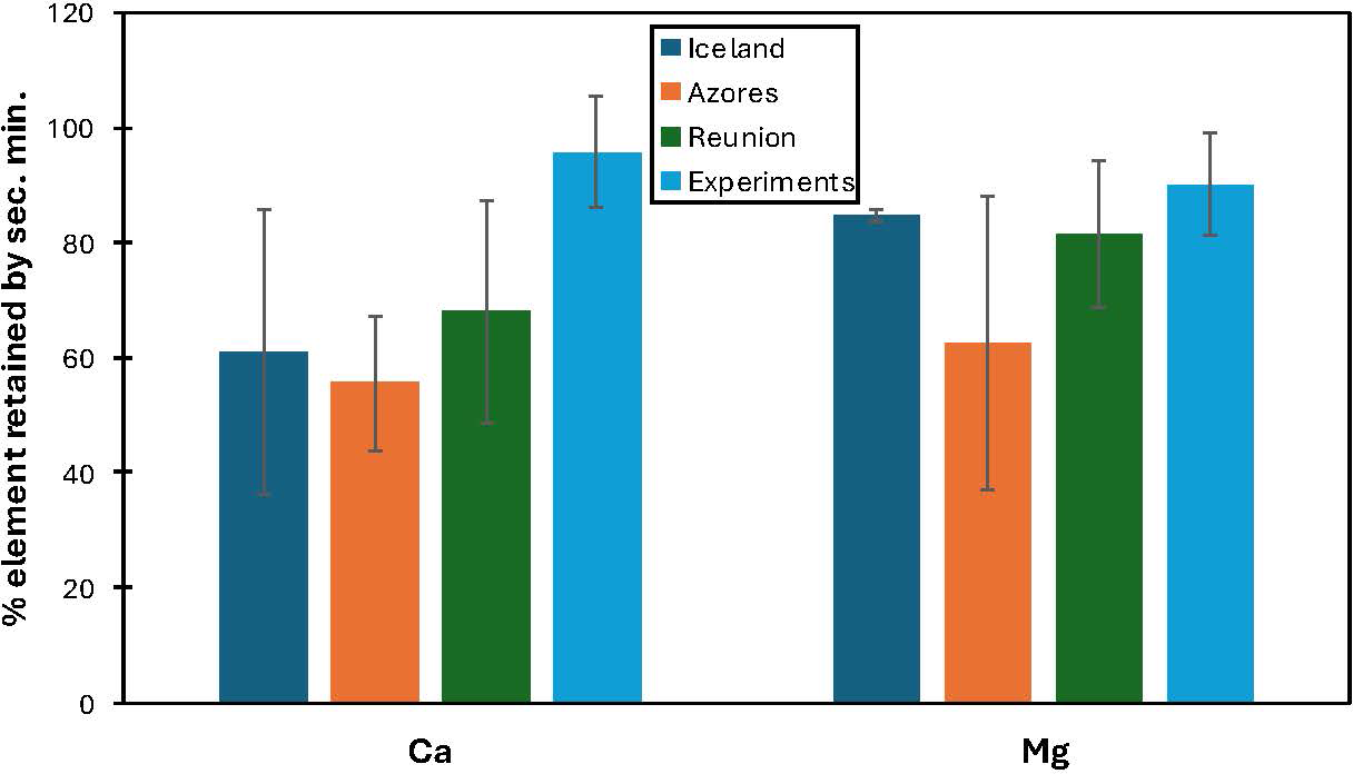 When observing element mobility in basaltic weathering, K and Na mostly stay in solution while, e.g. Fe and Mn mostly go into secondary minerals. For example, in a basanite from the Eifel region, Ca and Mg have mobilities around 5× less than Na, suggesting that 80 % of Ca and Mg are going into clays. In basaltic rivers, about 70 % of Ca is going into clays. Figure 2 summarizes estimates of the proportion of Ca and Mg from weathered basalt ending up in secondary precipitates (notably clay minerals) from several studies. It shows that the percentage of cations retained by secondary mineralisation is highly variable but a dominant process that needs to be taken into account with regard to the MRV of EW.