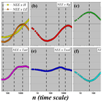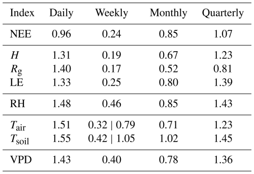 In Fig. 8e, the correlation between NEE and soil temperature (Tsoil) is presented. A correlation close to zero is observed for most scales, with discrete variations: a slight dip at the daily scale and a small increase at the weekly scale. In both cases, the correlation remains weak, with no apparent significance. These results indicate that soil temperature exerts little direct influence on the long-range fluctuations of NEE, playing a secondary role compared to other variables.
