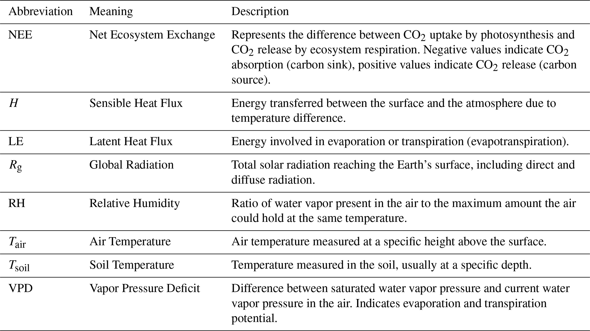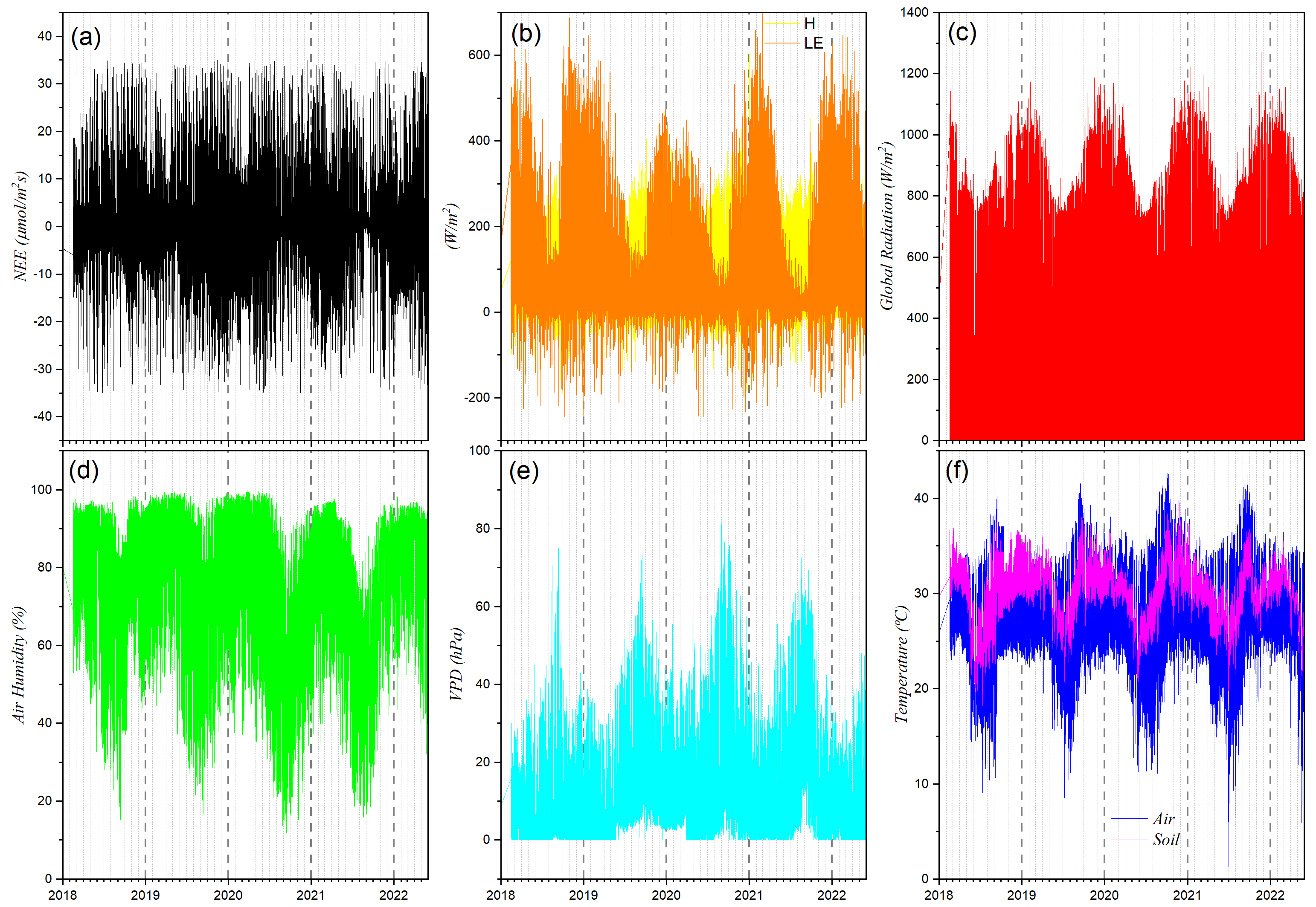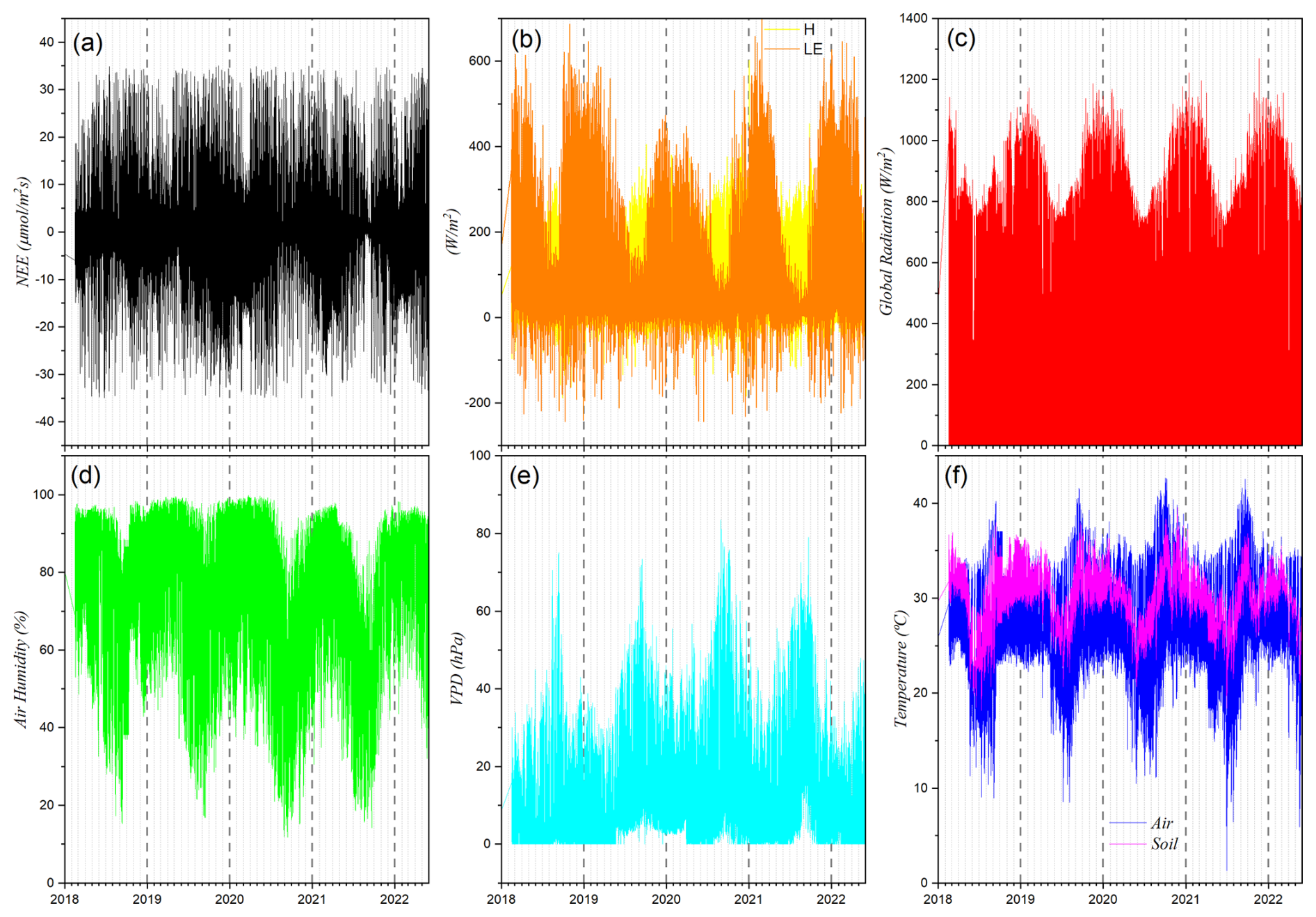 Dry season (June to September): characterized by positive NEE (net CO2 emission), lower temperatures, reduced global radiation, dominance of H over LE, low relative humidity, and high VPD.