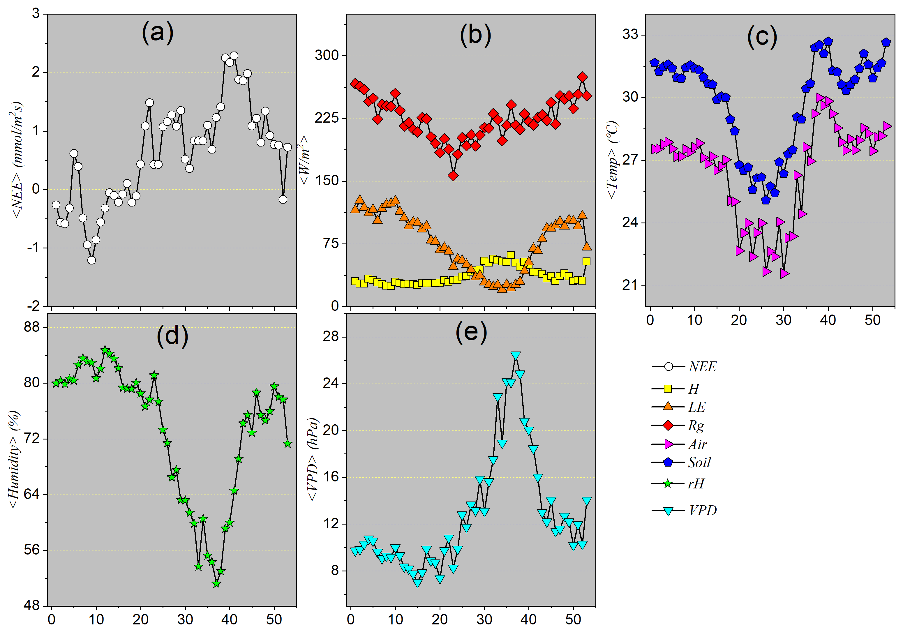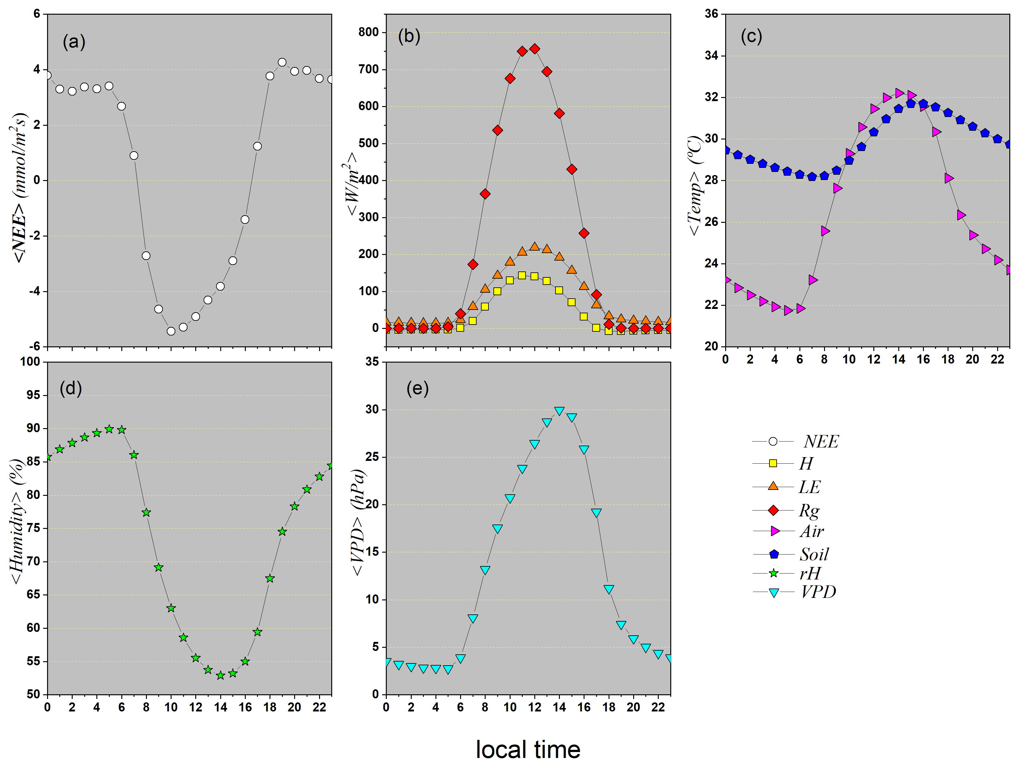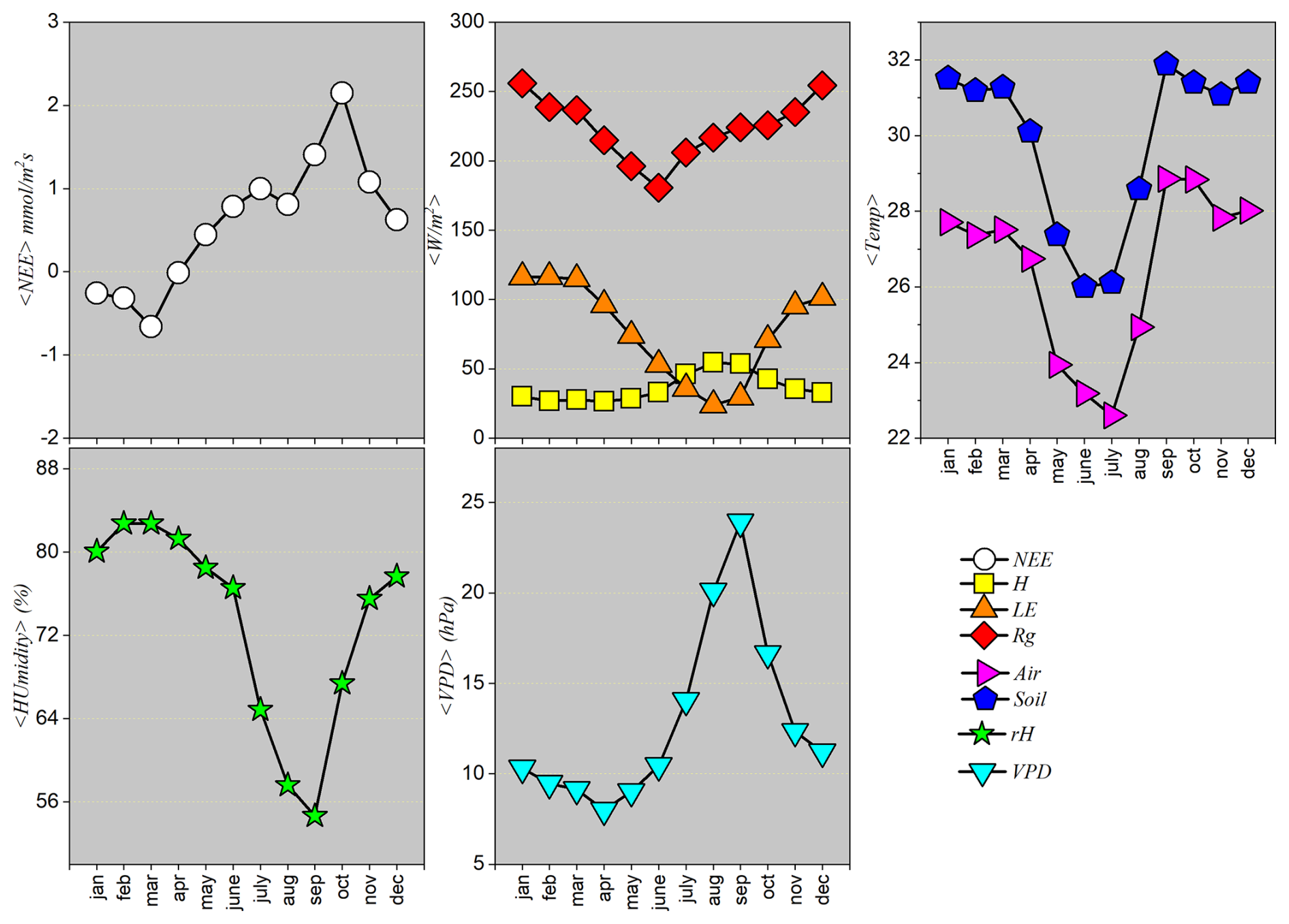 Rainy season (October to April): marked by negative NEE (net CO2 uptake), high temperatures, high global radiation, high LE, high relative humidity, and low VPD.