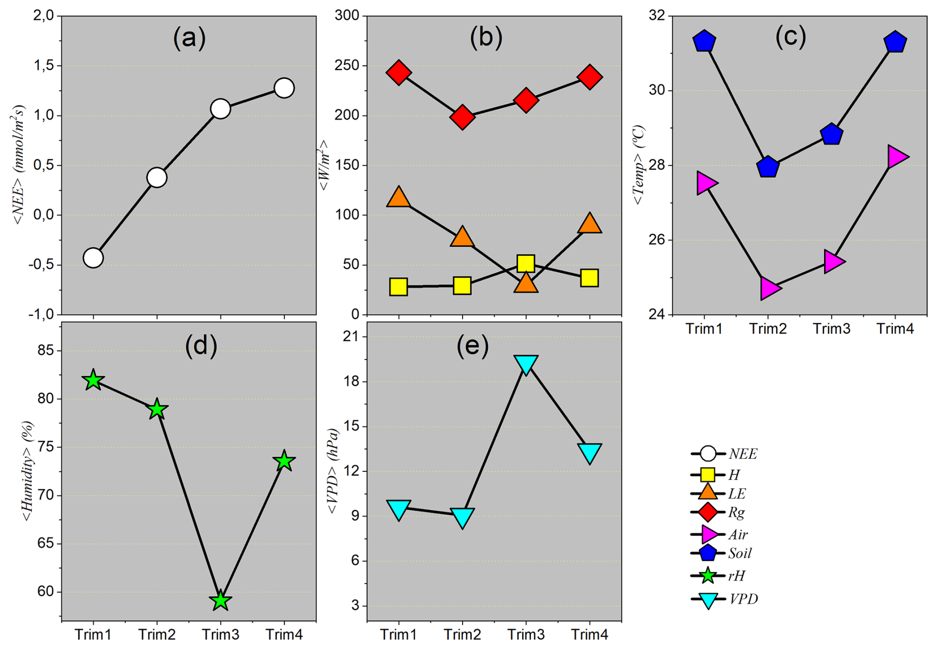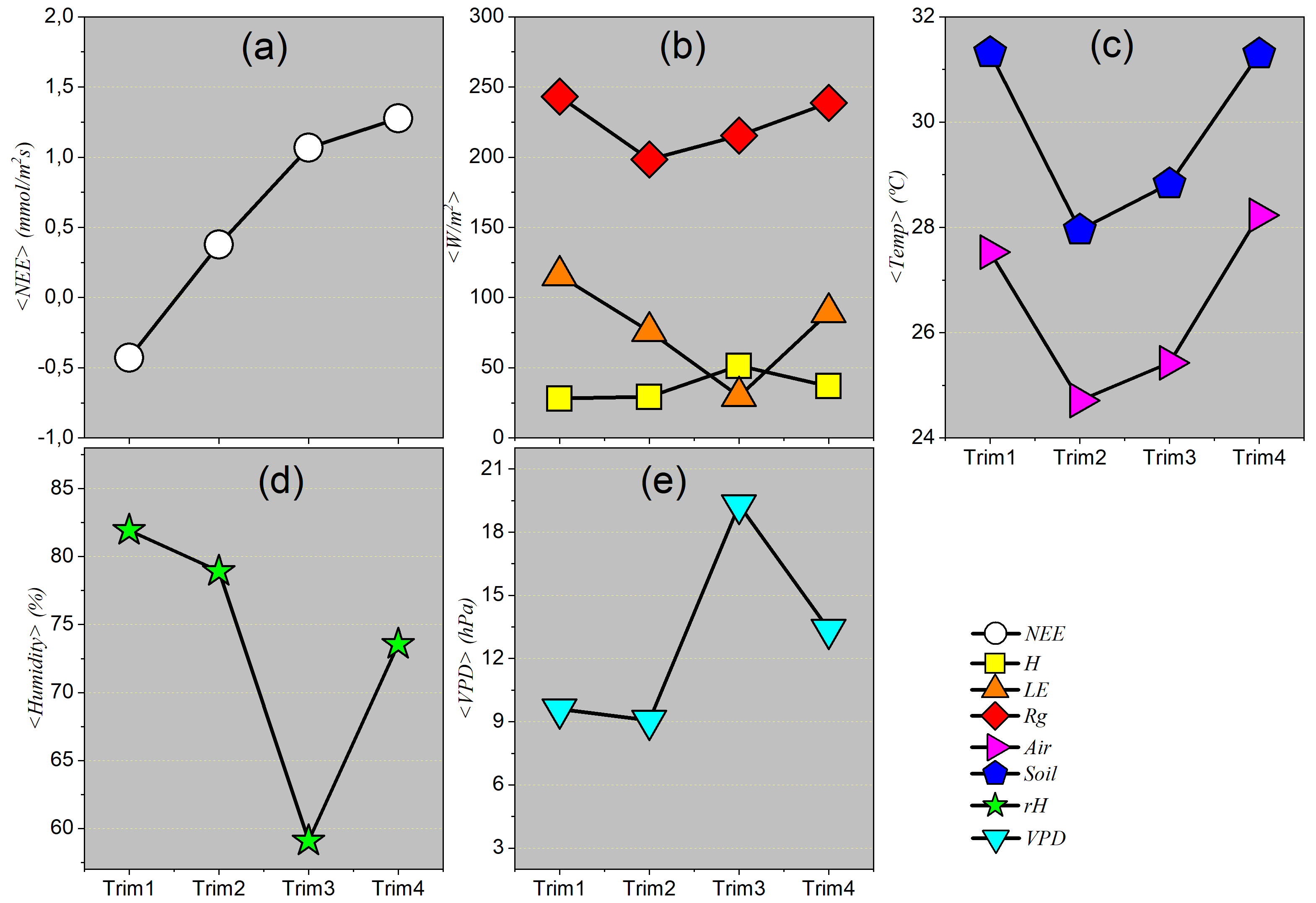 Quarterly averages represent an integrated synthesis of microclimatic conditions and the fluxes of energy and matter throughout the main seasonal phases of the year. Unlike the sequential analysis provided by monthly means, the quarterly approach offers representative “snapshots” of the ecosystem’s average behavior during the peak of the rainy season, the dry season, and transitional periods. This aggregation scale allows not only for the identification but also the quantification of the intensity and magnitude of the dominant processes in each season. For example, it becomes possible to highlight the predominance of latent heat flux (LE) during the wet season, in contrast with the dominance of sensible heat flux (H) during the dry season – allowing the amplitude of local seasonality to be defined based on concrete average values.
