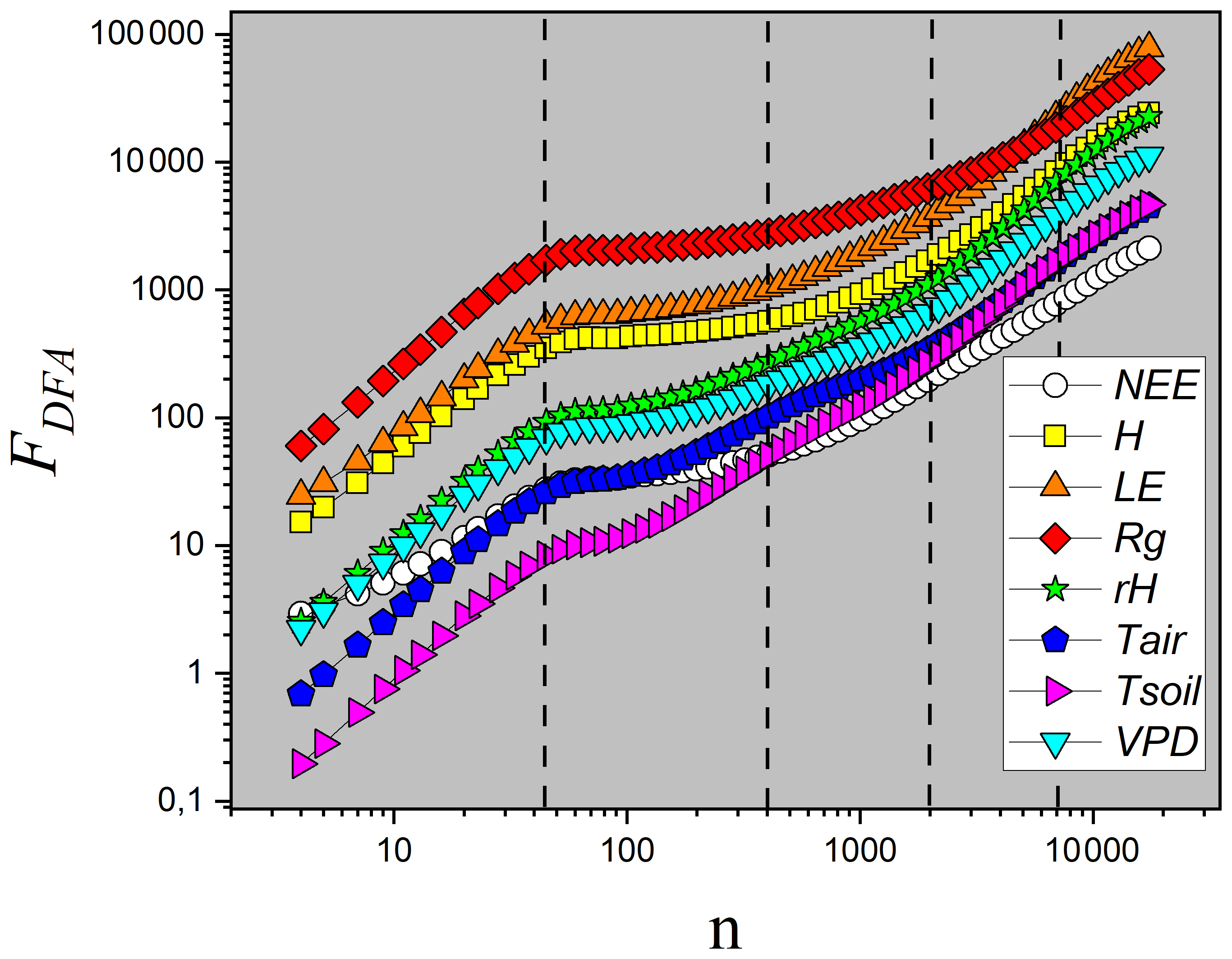 Figure 7Plot of FDFA as a function of the temporal scale n for the eight variables. In this analysis, n represents the number of observation windows, each with a 30 min duration. The vertical lines indicate the time scales of interest: daily (n=48), weekly (n=336), monthly (n=1440), and quarterly (n=4320).