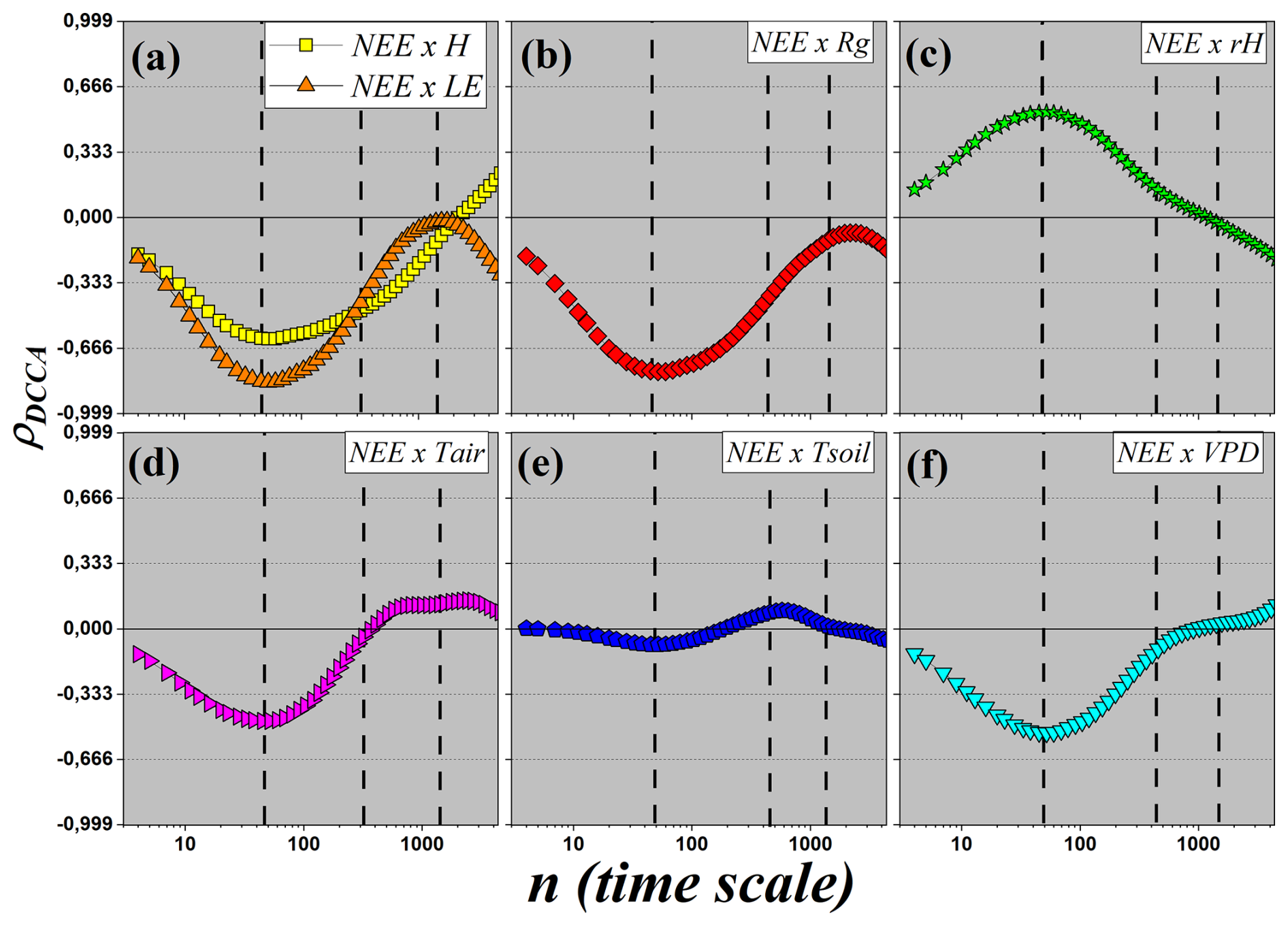 Figure 8DCCA cross-correlation coefficient (ρDCCA) as a function of the time scale n. Each panel displays the cross-correlation between the carbon flux (NEE) and one of the following micro-meteorological variables: (a) sensible (H) and latent (LE) heat fluxes; (b) global radiation (Rg); (c) relative air humidity (RH); (d) air temperature (Tair); (e) soil temperature (Tsoil); and (f) vapor pressure deficit (VPD).