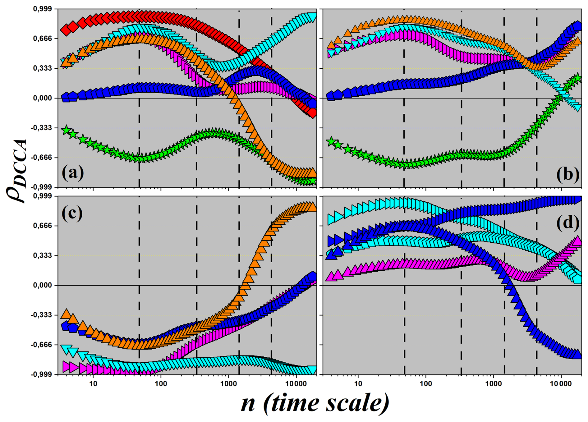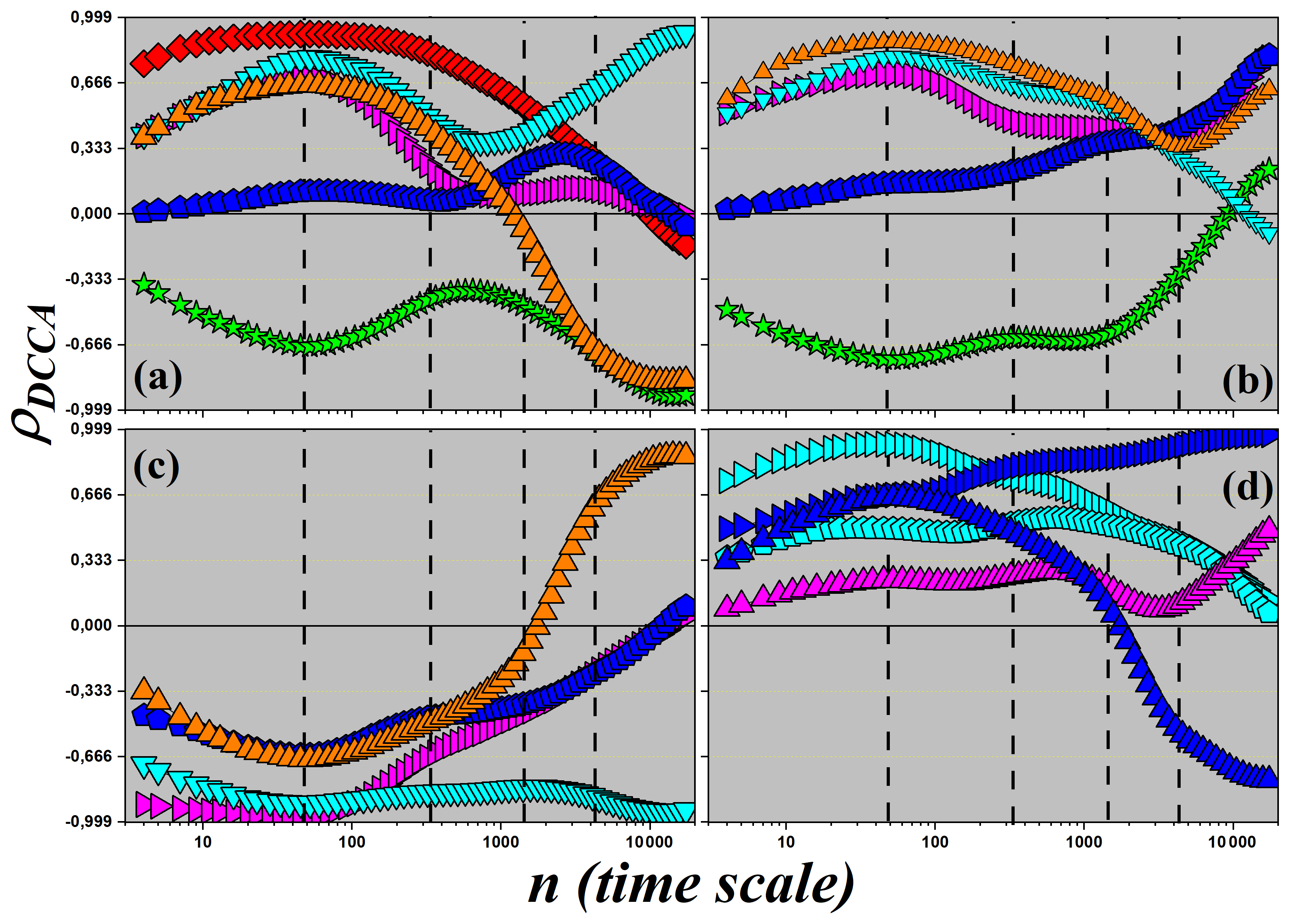 Figure A1Detrended cross-correlation coefficient, ρDCCA, as a function of time scale n for all variable pairs in the study, except NEE.