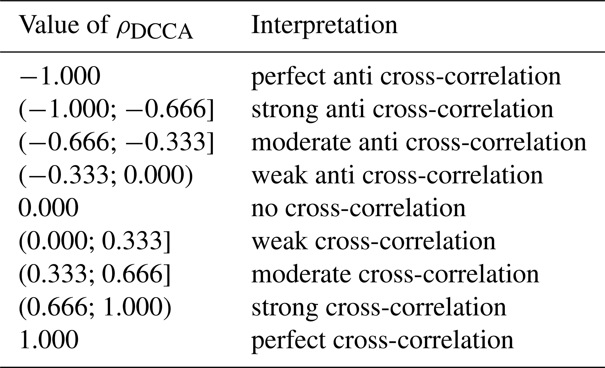The interpretation of possible values of ρDCCA is shown in Table 2, noting that ρDCCA(n) ranges from −1 to 1. This was first postulated in Zebende (2011), in face of others conventional metrics. The main advantage of using the coefficient ρDCCA lies in its ability to quantify the level of cross-correlation between non-stationary time series, where traditional correlation measures (e.g., Pearson's coefficient) fail due to their sensitivity to trends and nonstationarity. Unlike the classical cross-correlation function, which assumes stationarity, ρDCCA is scale-dependent and normalized, ranging from −1 to 1, making it suitable for detecting and quantifying correlations embedded in power-law noise and non-stationary signals. Furthermore, as shown in Zebende (2011), ρDCCA establishes a direct relationship between the long-range auto-correlation exponents α1,α2 and the cross-correlation exponent λ, allowing a consistent and robust interpretation of long-range interactions that cannot be captured by conventional metrics.