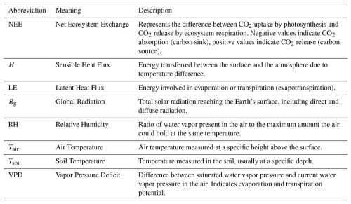 Based on observations collected by the micrometeorological station, time series were constructed for the eight analyzed variables, as illustrated in Fig. 2. Among them, we highlight the Net Ecosystem Exchange (NEE) as the dependent variable. This variable exhibits a marked diurnal pattern: during the day, it tends to negative values, indicating CO2 uptake by vegetation through photosynthesis; at night, values become positive, reflecting CO2 release by respiration. Figure 2a also reveals seasonal fluctuation, with NEE values ranging approximately from −40 to +40 , consistent with the annual vegetation growth cycles.