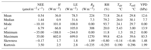 Table 4 summarizes the main indicators of descriptive statistics for the investigated variables. For NEE, a slightly positive mean (0.54) is observed, while the median (1.44) and mode (−10.10) suggest an asymmetric distribution. The other variables follow patterns consistent with regional climatology, exhibiting high values for LE and Rg, broad thermal variation, and moderate asymmetries.