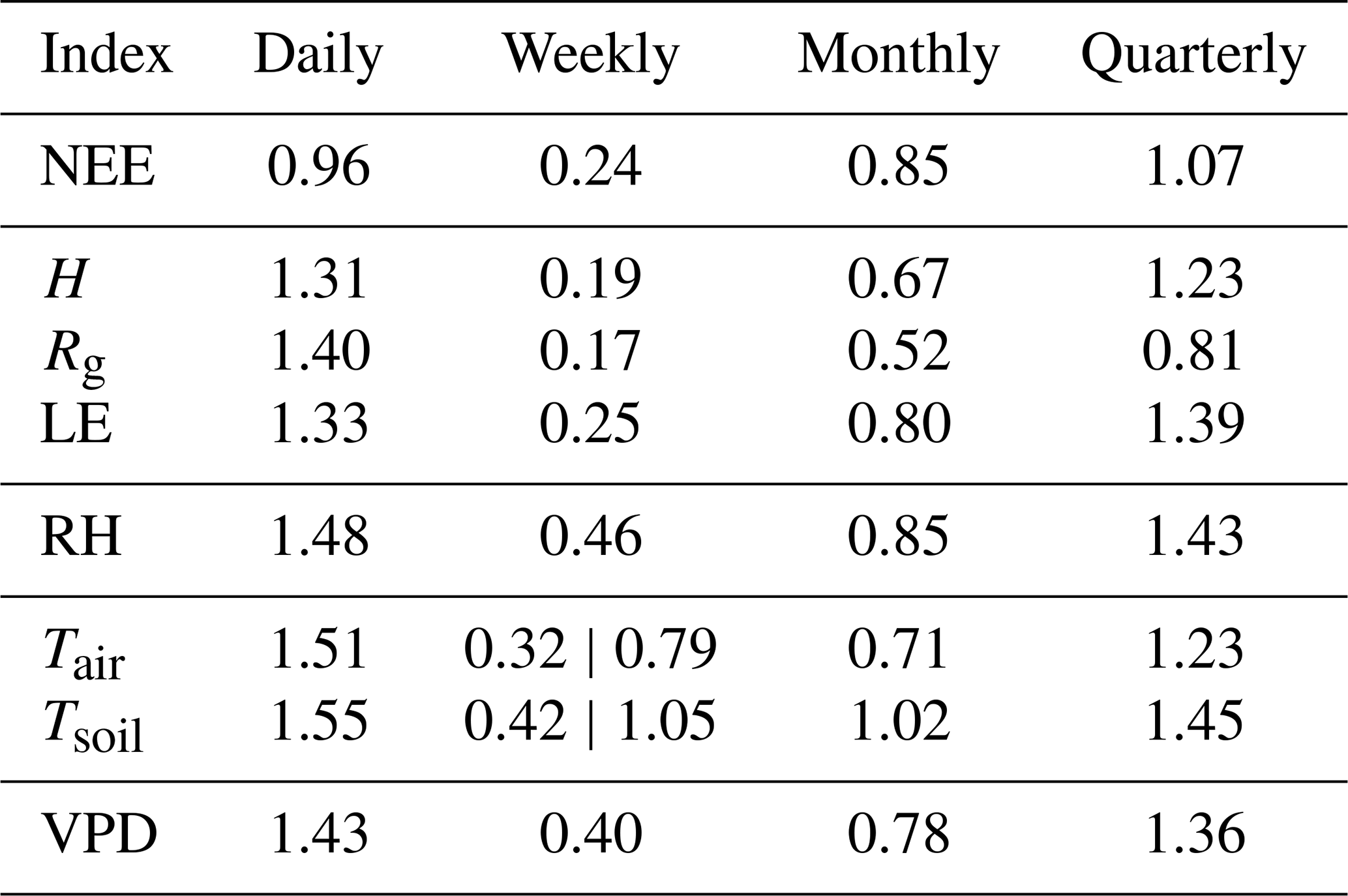 Weekly time scale, where (note that for temperatures, there are two values for the weekly scale, reflecting a change in behavior within this scale);