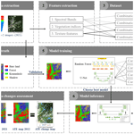 Random Forests (RF) was an ensemble classifier widely used in remote sensing due to its ability to handle high-dimensional data. It generates multiple decision trees (DTs), where each tree made predictions based on observed features through a series of decision-making steps, ultimately concluding the target variable. Decision trees, also known as classification trees, were a type of predictive model. Random forests used the Bagging algorithm (Bootstrap Aggregating) as their core classification mechanism. The process began by randomly sampling the data to create training datasets. After each sampling, the selected data points were returned to the dataset for the next round of sampling (bootstrap sampling) (Breiman, 2001). This process was repeated multiple times, resulting in several training datasets, which were then used to train multiple decision trees. This approach allowed for scenarios where specific data points were sampled multiple times while others may not. Each decision tree selected a random subset of features at each node to determine the best split, ultimately generating predictions from each tree. The final classification result was determined by aggregating the predictions of all decision trees through a majority voting approach, which means that each tree casts one “vote” for a class label, and the class receiving the most votes becomes the final prediction. To evaluate the importance of each feature, the Random Forest model uses the Gini Index (Breiman, 2001), which measures the impurity of a node. A node represents a point in the tree where the dataset is split based on a feature, with each node divided using the best split among a random subset of explanatory variables (Breiman, 2001). A lower Gini value indicates better class separation. The Gini Index for a node m is calculated as follows: