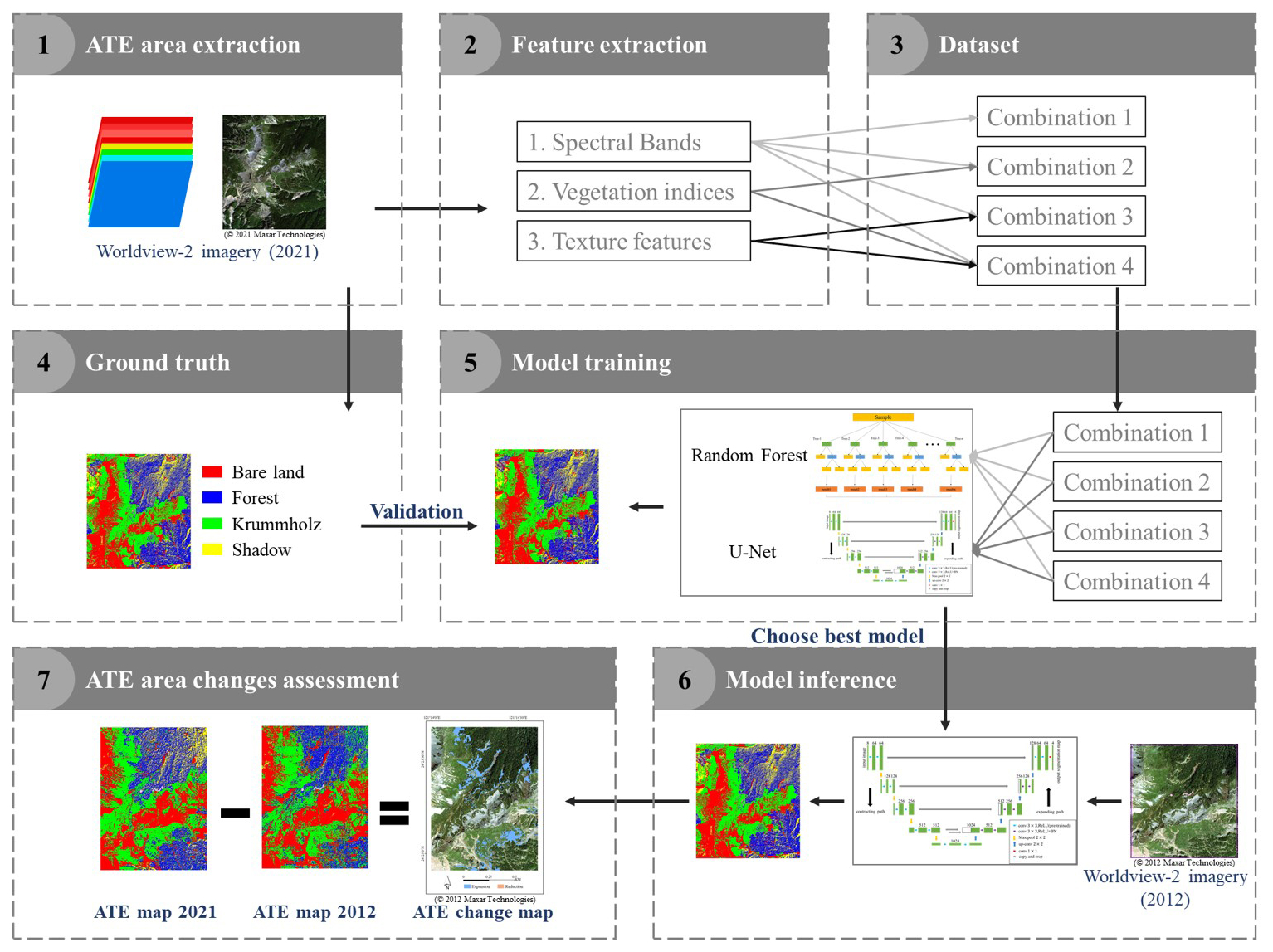 This study utilized WorldView-2 satellite imagery from 2021 to extract raw spectral bands, vegetation indices, and texture features. Starting with the eight spectral bands, vegetation indices, and texture features were sequentially added to form four different feature combinations. Classification models were developed using the RF and U-Net models, and the optimal model is selected. This model is then applied to 2012 imagery to map the distribution of the alpine treeline and analyzed changes over the decade. The research workflow was illustrated in Fig. 2.