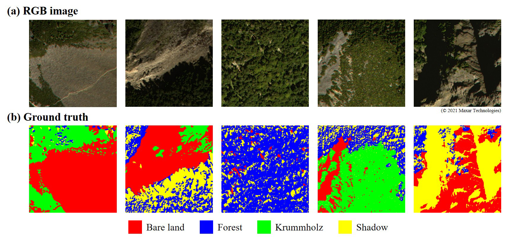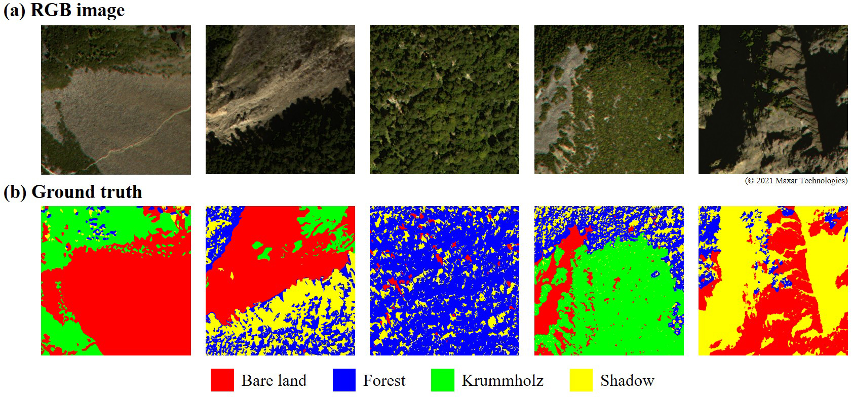 Ground truth data in the study area were manually labeled using a pixel-based approach and categorized into four classes: (1) bare land, referring to areas of exposed soil, rock surfaces, or sparsely vegetated ground; (2) forest, defined as regions with dense, continuous tree canopy cover; (3) krummholz, representing stunted, shrub-like trees typically found at high elevations near the treeline and shaped by wind or snow pressure (Liao et al., 2023a); and (4) shadow, representing regions with low reflectance caused by topographic shading or solar angle effects. The class definitions were established based on visual inspection and field knowledge of the study area (Fig. 4). The labeling process was independent and performed by visually interpreting the pansharpened RGB composite imagery, referencing known terrain characteristics, and assisted by field-collected GNSS survey points.