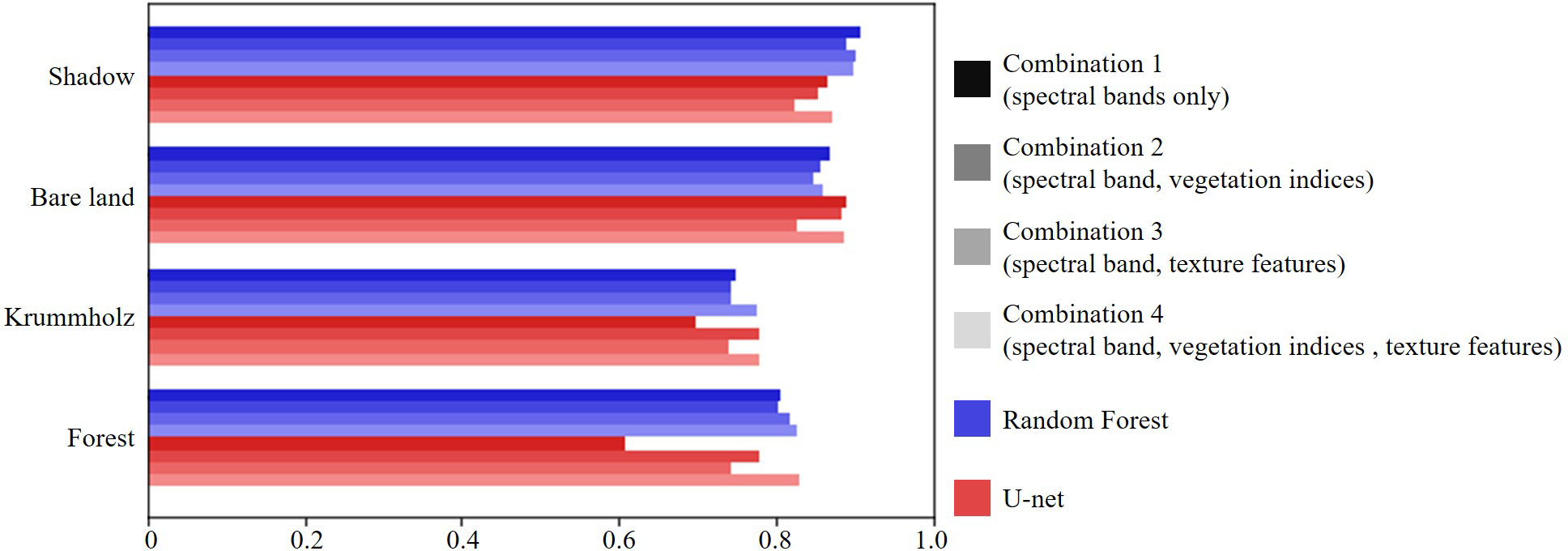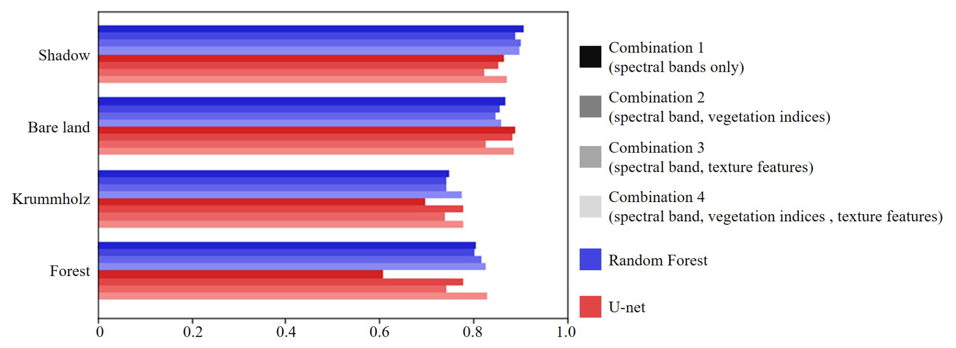 Figure 5F1-scores for four land cover classes (forest, krummholz, bare land, shadow) using RF and U-Net models with different feature combinations.