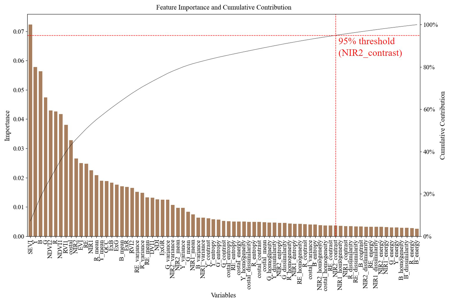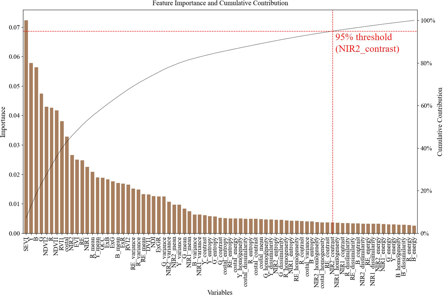 Based on the RF and U-Net model results, a further feature importance analysis was conducted to assess individual features in combination 4, comprising 77 features, including spectral bands, vegetation indices, and texture features. The feature importance analysis results revealed that the cumulative contribution achieved 95 % interpretability with 61 features. Additionally, the OA and Kappa values improved slightly to 0.842 and 0.784, respectively. Moreover, computation time was reduced by 14.3 % due to fewer features (Table 6). According to the feature ranking results, spectral bands and vegetation indices ranked higher than texture features, with SEVI, Y, B, G, and NDVI2 identified as the top five features (Fig. 6).