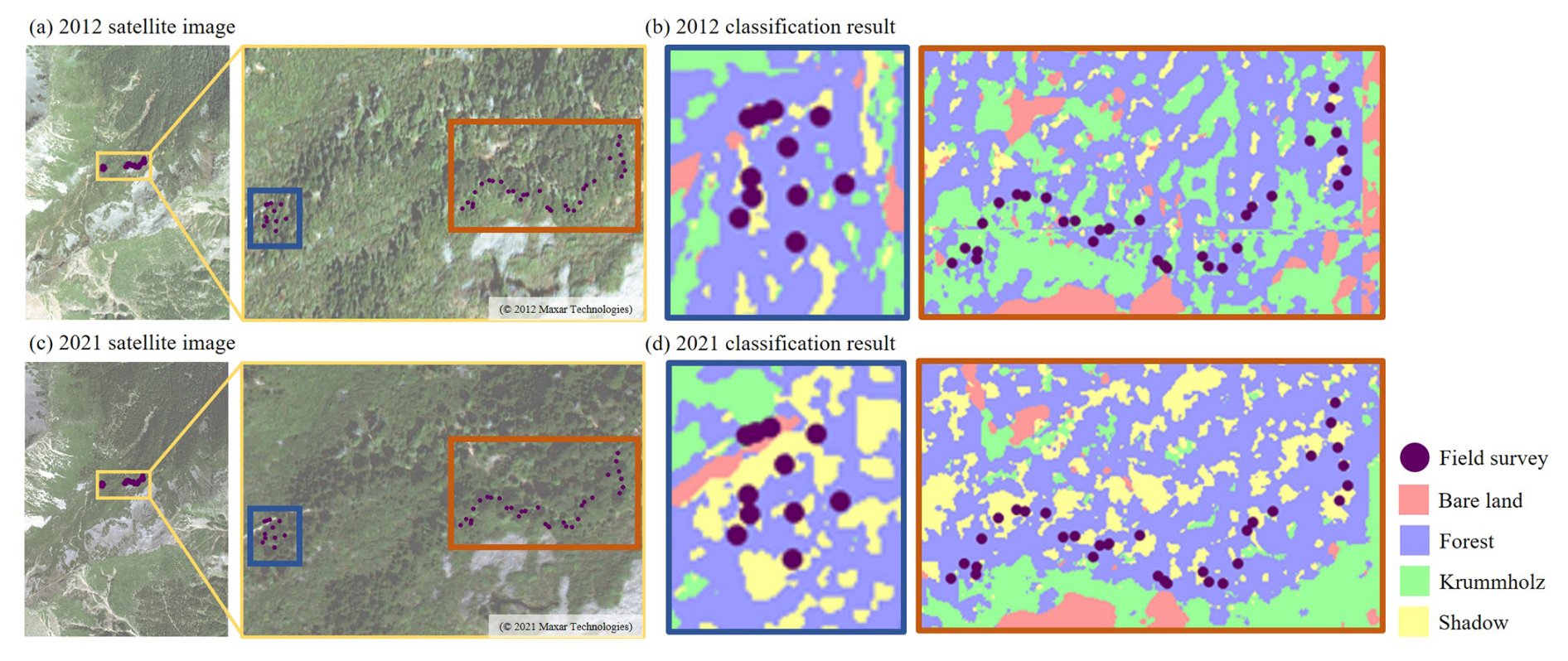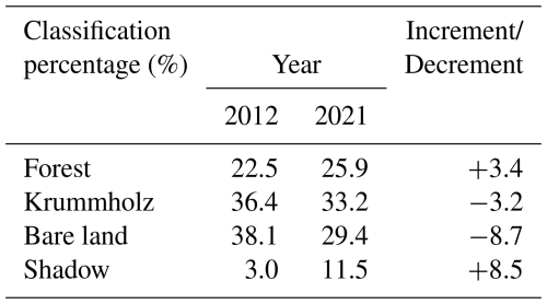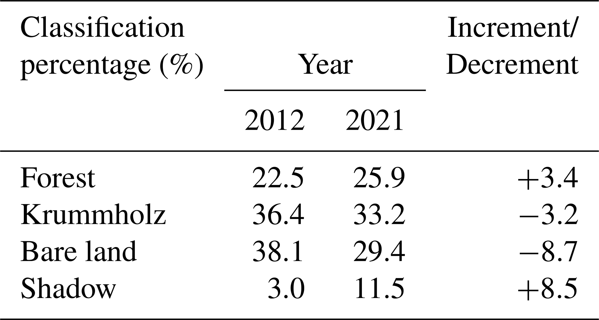 Table 7Percentage of each land cover class in 2012 and 2021 classification results. Forest and shadow areas increased over time, while krummholz and bare land decreased.