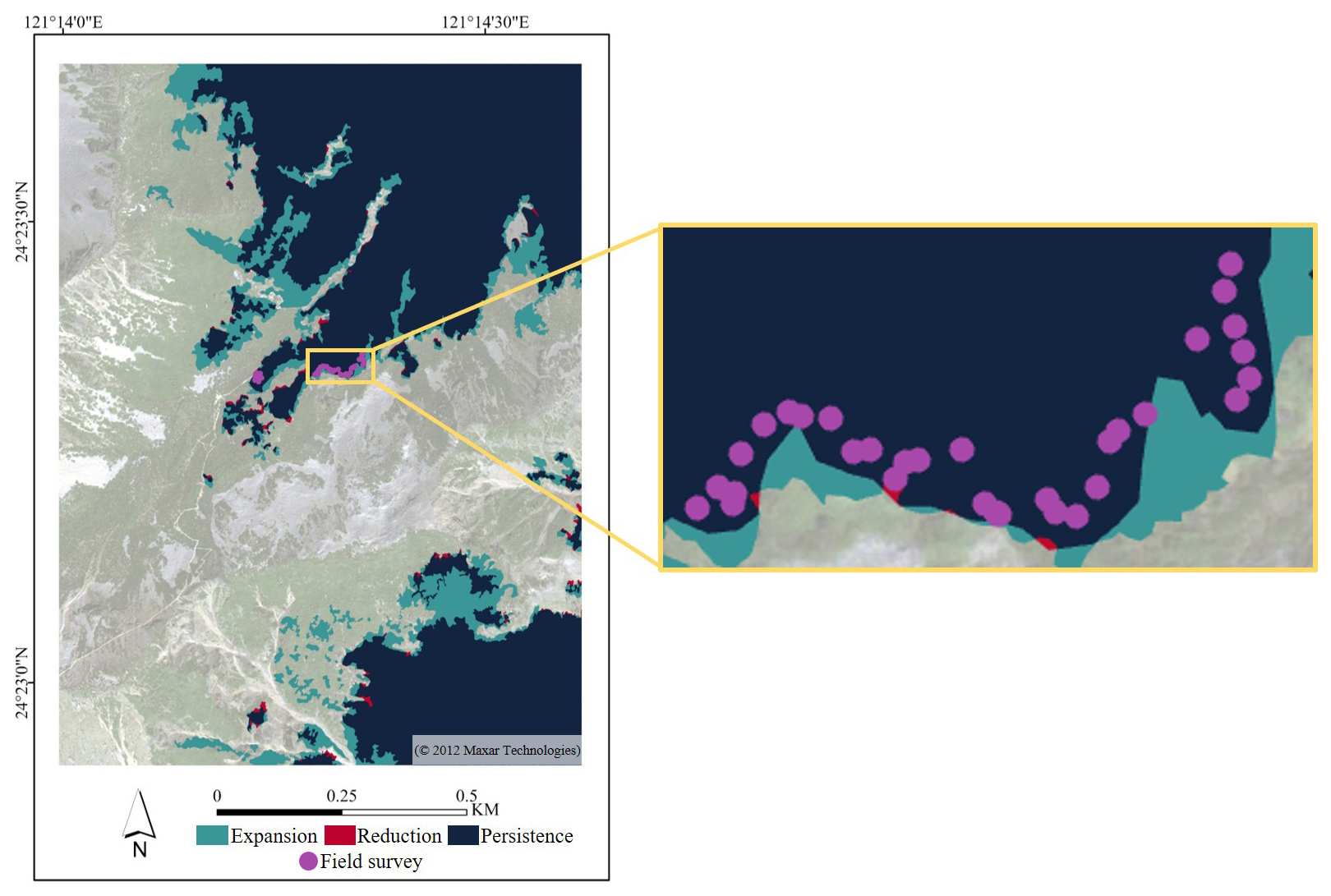 In Taiwan, many alpine forest studies have been conducted through field surveys using an ecological approach at relatively small spatial scales, focusing on flowering phenology and growth assessment for specific tree species (Chiu et al., 2022; Liao et al., 2023a; Kudo et al., 2024). In recent years, Chung et al. (2021) used Landsat 8 imagery combined with support vector machine (SVM) classification to examine timberline dynamics on Taiwan's highest peak, Yushan, revealing the influence of temperature on timberline shifts. The Xue Mountain, Taiwan's second-highest peak, has also been the subject of long-term ecological monitoring (Chung et al., 2021; Liao et al., 2023b). However, extensive targeting alpine treeline ecotone (ATE) dynamics remains lacking. This study provides the first comprehensive analysis of changes in the ATE landscape in Taiwan's Xue Mountain glacial cirque region. It uses ultra-high-resolution WorldView-2 satellite imagery with Random Forest (RF) and U-Net models. The aim is to quantify spatiotemporal changes between 2012 and 2021.