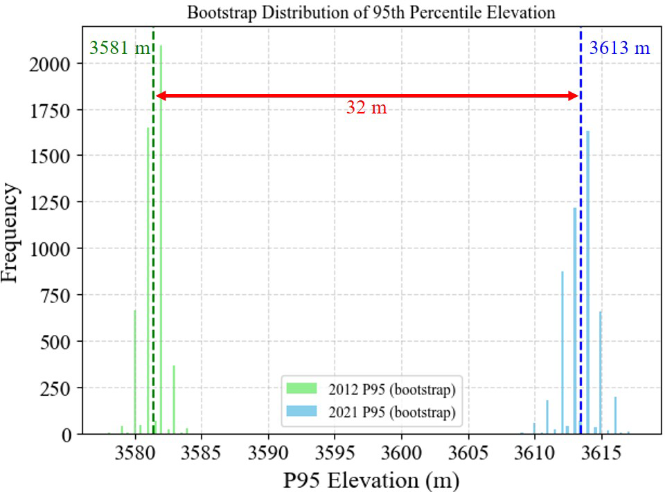 Figure 9Bootstrap distribution of the 95th percentile elevation of forest cover for 2012 and 2021. The histogram shows the frequency of estimated 95th percentile elevations (P95) based on resampling. Green bars represent 2012 estimates, while blue bars represent 2021. The dashed vertical lines indicate the mean P95 value for each year.