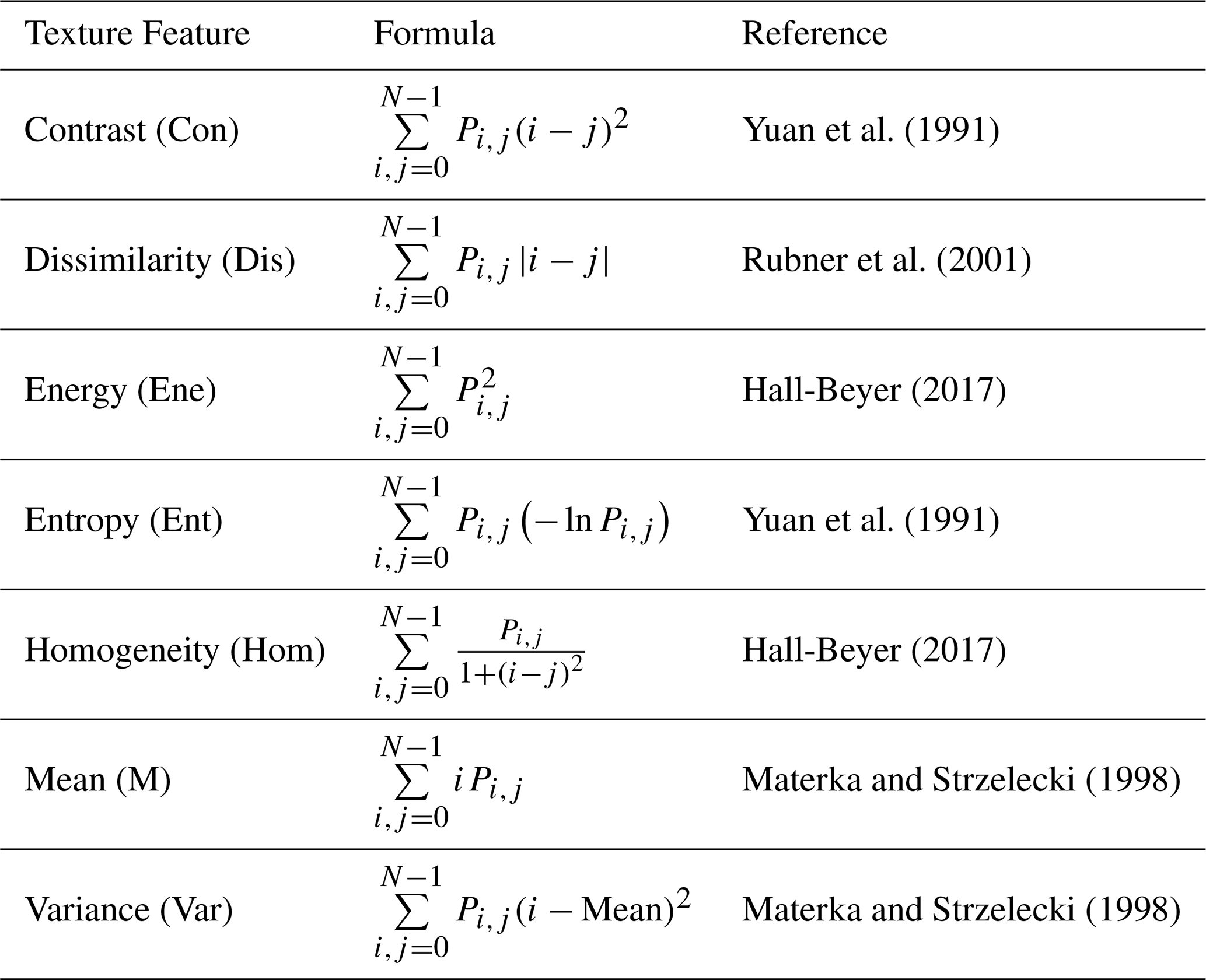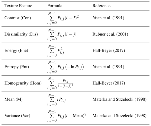 Hall-Beyer, M.: GLCM texture: A tutorial v. 3.0 March 2017, University of Calgary, https://ucalgary.scholaris.ca/items/8833a1fc-5efb-4b9b-93a6-ac4ff268091c (last access: 14 January 2025), 2017.