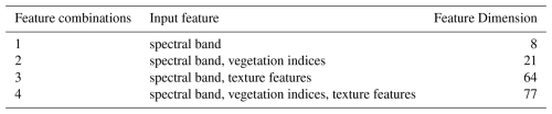 Table 4Definitions of the four feature combinations used in model training. The table shows the input feature types and their corresponding dimensionality.