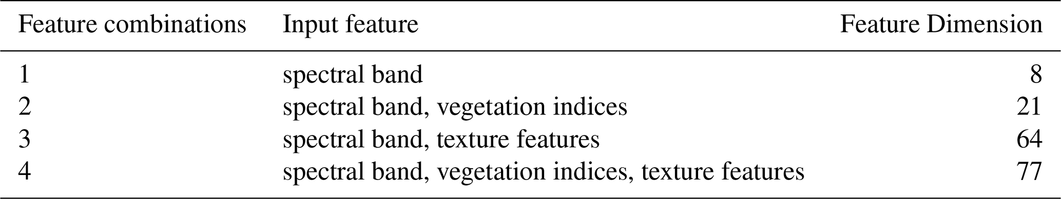 The WorldView-2 satellite imagery consists of eight spectral bands. Based on these eight bands, this study derived 13 vegetation indices and 56 texture features, resulting in 77 feature variables. The original eight bands were incrementally combined with vegetation indices and texture features, forming four different feature combinations (Table 4).