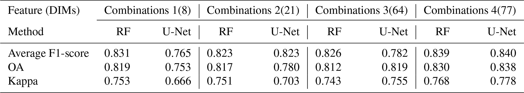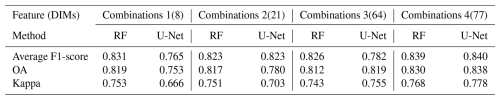 Table 5Evaluation of classification accuracy using different feature combinations and models. Average F1-score, Overall accuracy (OA) and Kappa coefficient are shown for Random Forest (RF) and U-Net models. Numbers in parentheses indicate the number of input features. Bold values indicate the best results for each metric.
