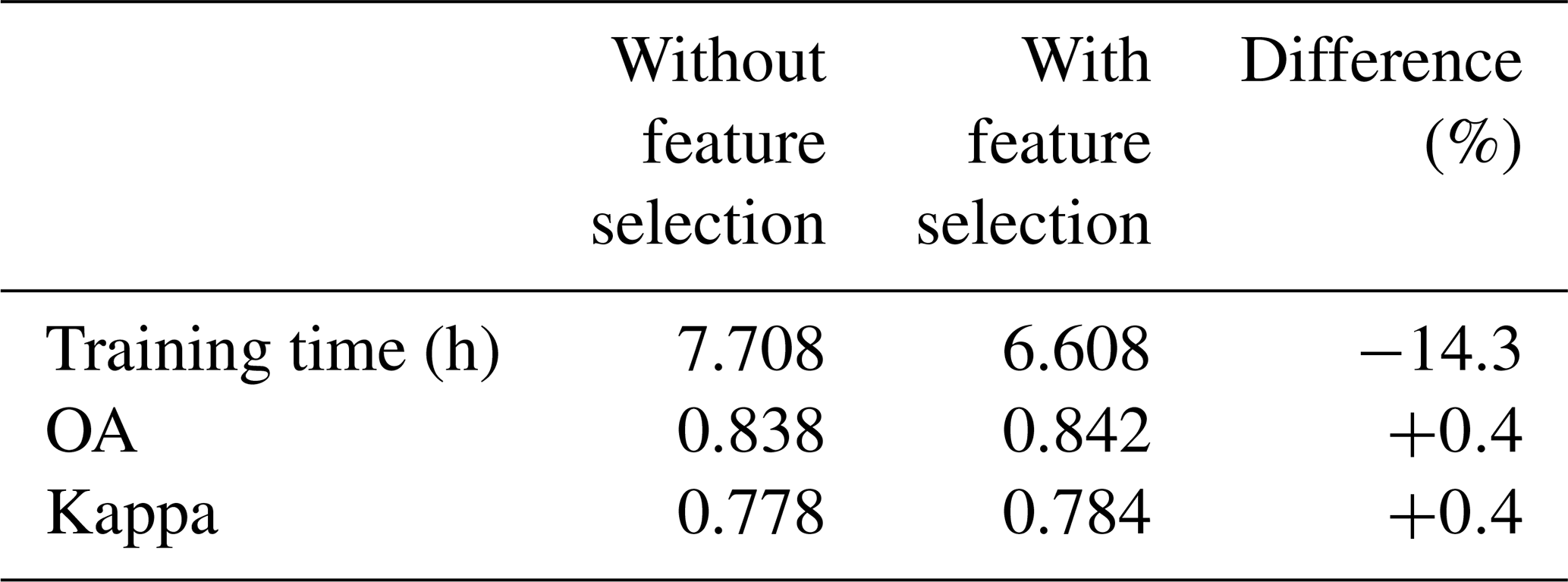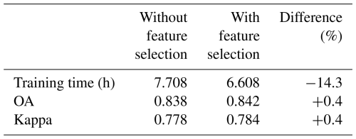 Table 6Comparison of model performance before and after feature selection. Training time is presented in hours. The results show reduced training time and slightly improved classification accuracy after feature selection.