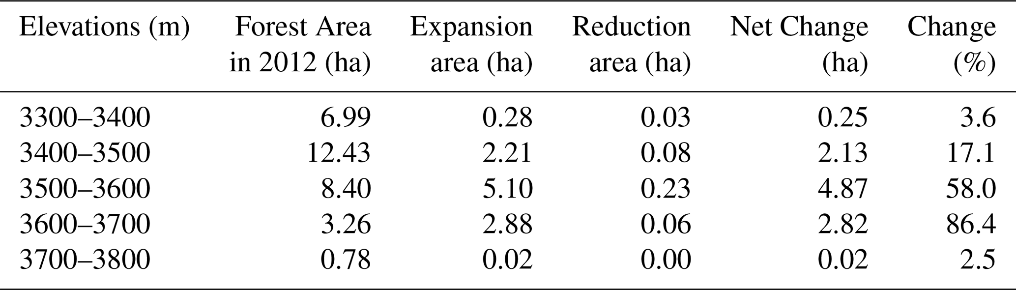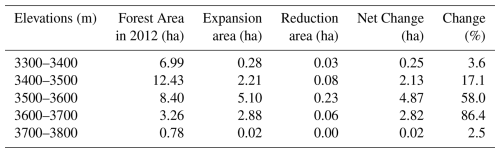Based on the 95th percentile of DEM elevation values for all pixels classified as forest (Fig. 9), the elevation difference increased by 32.00 m between 2012 and 2021. The 95 % confidence interval (± 4.00 m) was estimated using a bootstrap resampling method (5000 iterations). Differences in area changes across various elevation ranges are detailed in Table 8, with the most significant changes occurring in the 3600 to 3700 m range, which corresponds to the primary treeline ecotone change zone in the Xue Mountain region. In comparison, the most stable area was observed in the 3700 to 3800 m range, where minimal forest presence was detected in both 2012 and 2021, reflecting physiological limits of trees.