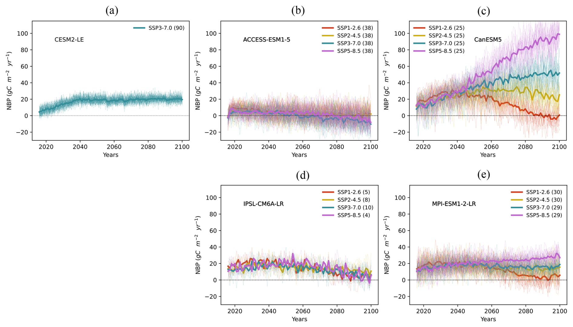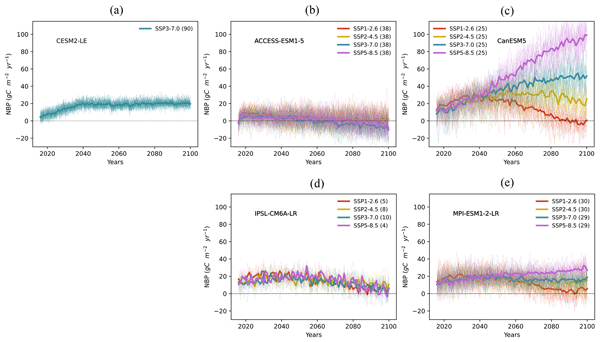 Figure 4The time series of future NBP from 2016 to 2100 across five ESM large ensembles. The four future scenarios include SSP1-2.6 (red line), SSP2-4.5 (yellow line), SSP3-7.0 (green line), and SSP5-8.5 (purple line). Thin lines represent individual simulations, while thick lines represent the ensemble mean for each scenario. The number of simulations for each model scenario is indicated in the legend next to the scenario label.