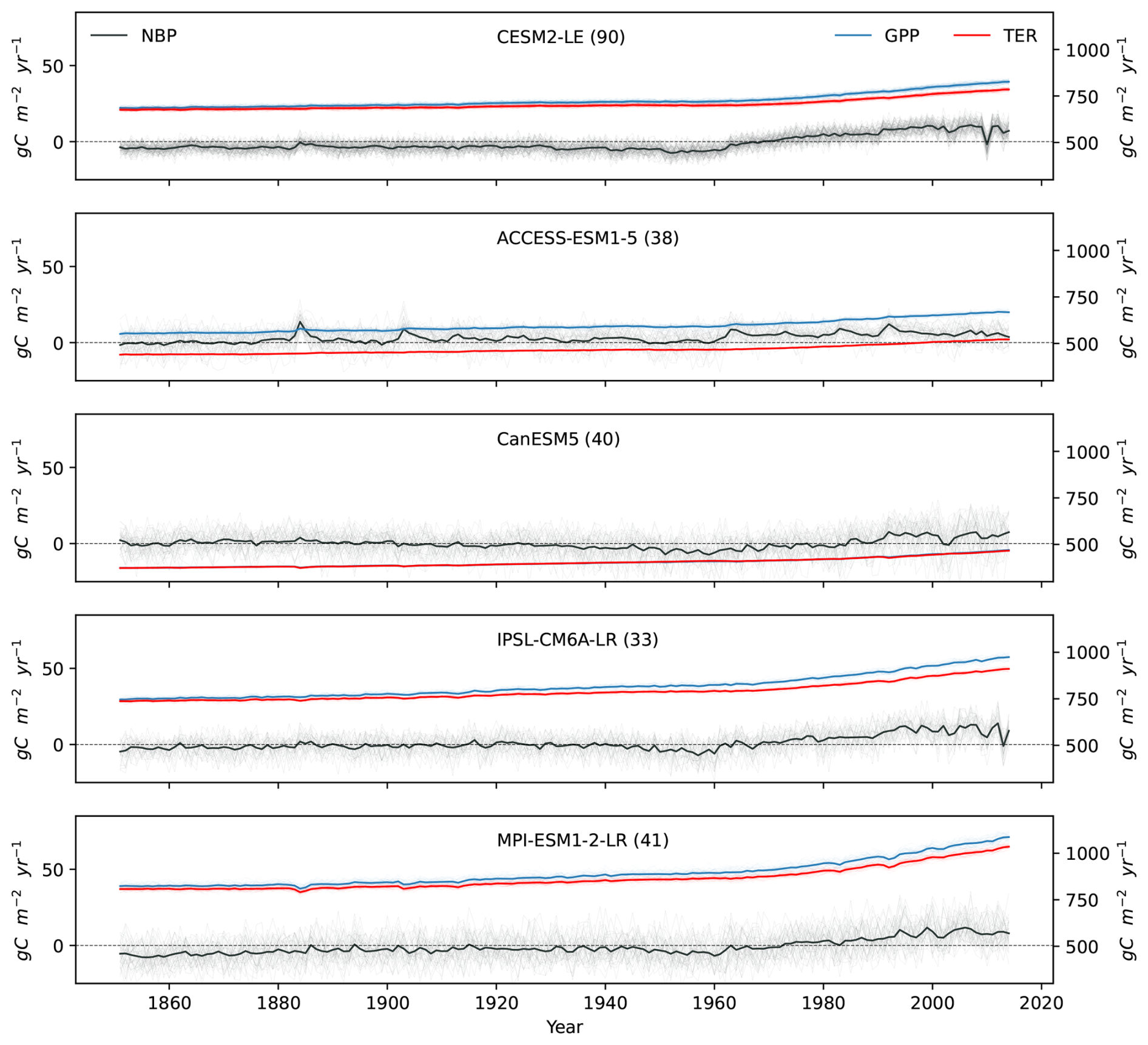 We then examine the time series of GPP and TER in the historical simulations (Fig. 1). Both GPP and TER show similar trends across models, though ACCESS-ESM1-5 shows a larger magnitude difference (Fig. 1). The ensemble mean of GPP and TER are similar until the 1960s, after which GPP slightly surpassed TER (Fig. 1). year-to-year variations are minor compared to the long-term trend in the ensemble mean, suggesting that photosynthesis and respiration are strongly influenced by anthropogenic perturbations. Because the trends in GPP and TER largely compensate when combined to calculate NBP, the resulting NBP exhibits smaller long-term trends but pronounced interannual variability.