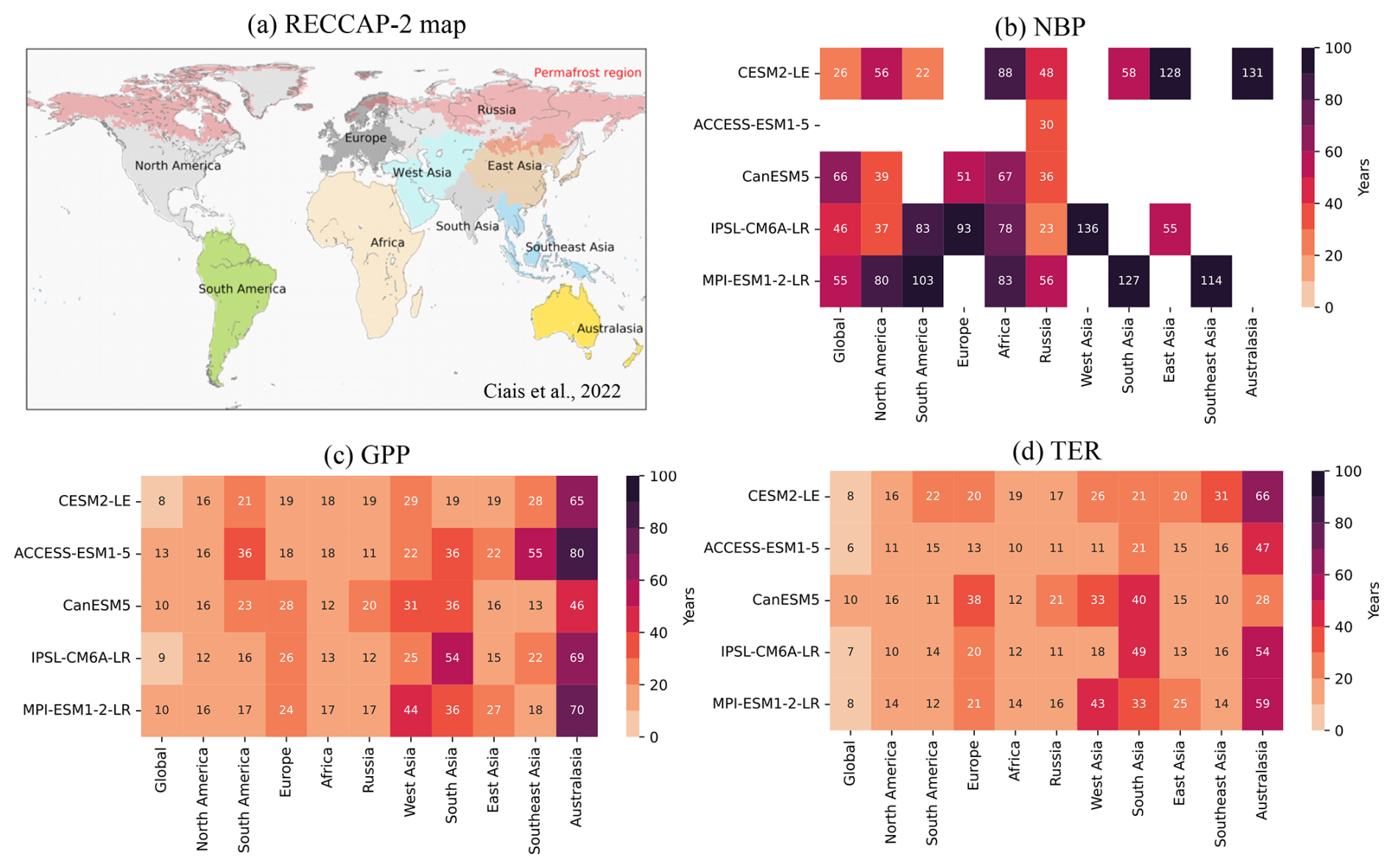 Figure 2ToE of NBP on a global scale and across 10 RECCAP-2 regions, under historical simulations of five ESM large ensembles. Note that ToE is the years detectable after 1960, and is calculated with signal period of 1960–2009 relative to the noise period of 1930–1959, details please check Sect. 2.4. (a) RECCAP-2 map (reproduced from Ciais et al., 2022, Fig. 1, distributed under the Creative Commons Attribution 4.0 License) that divides the global continents into 10 domains. Note that the RECCAP-2 map is aggregated from 0.5° × 0.5° to 2.5° × 2.5°, the spatial domains are slightly changed. (b) Heat map of the ToE in global and each spatial domain of NBP. (c) and (d) are heat maps of the ToE in global and each spatial domain of GPP and TER separately. Domains with no significant signal (P>0.05) or ToE longer than 150 years are shown as empty squares.